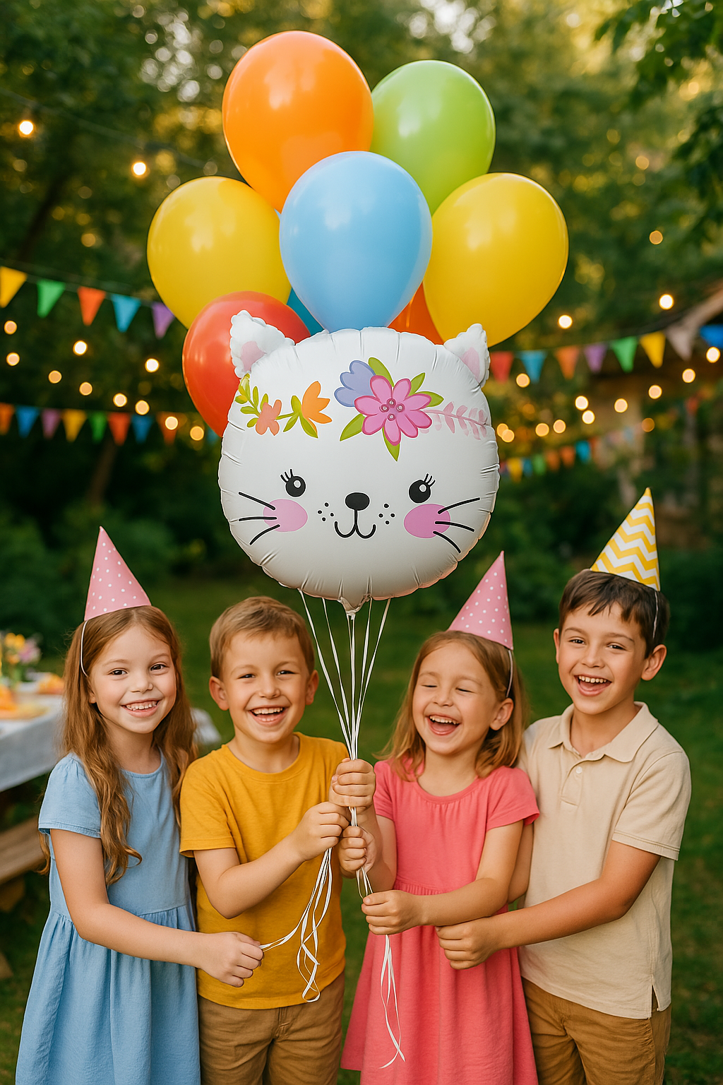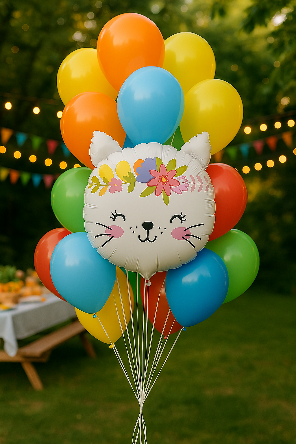 Balon foliowy w kształcie głowy kota, idealny na różnego rodzaju przyjęcia i uroczystości. Balon przedstawia białą kocią twarz z dużymi, czarnymi oczami, różowymi policzkami i wąsami. Na głowie kota znajduje się kolorowa korona z kwiatów w odcieniach różu, fioletu i zieleni. Balon jest wykonany z wysokiej jakości folii, co zapewnia jego trwałość i długotrwałe utrzymanie powietrza. Doskonały jako dekoracja na urodziny, baby shower, czy inne okazje, które wymagają wyjątkowego i radosnego akcentu.
