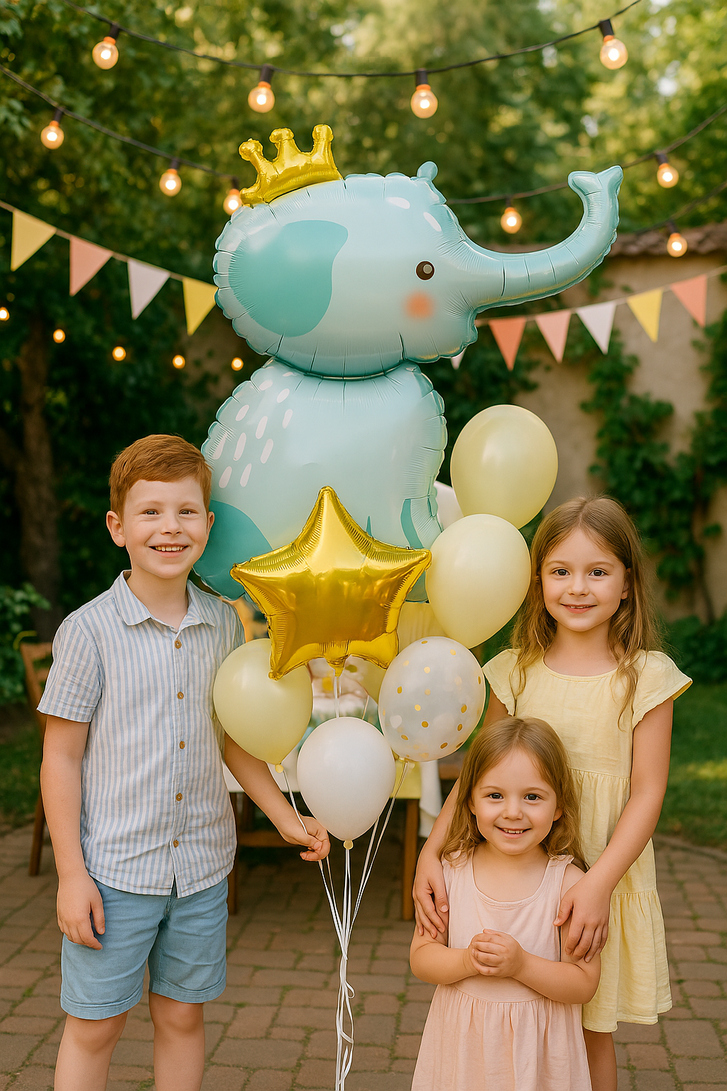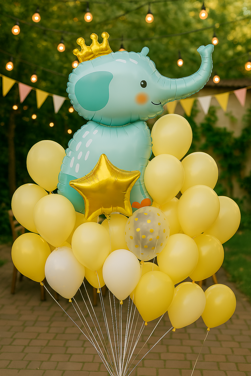 Balon foliowy w kształcie słonia z koroną, idealny na przyjęcia urodzinowe, baby shower czy inne okazje. Balon ma pastelowe kolory, z dominującym odcieniem błękitu, oraz złotą koronę na głowie słonia. Balon jest wykonany z wysokiej jakości folii, co zapewnia długotrwałe utrzymanie powietrza. Doskonały jako dekoracja lub prezent dla dzieci i dorosłych.