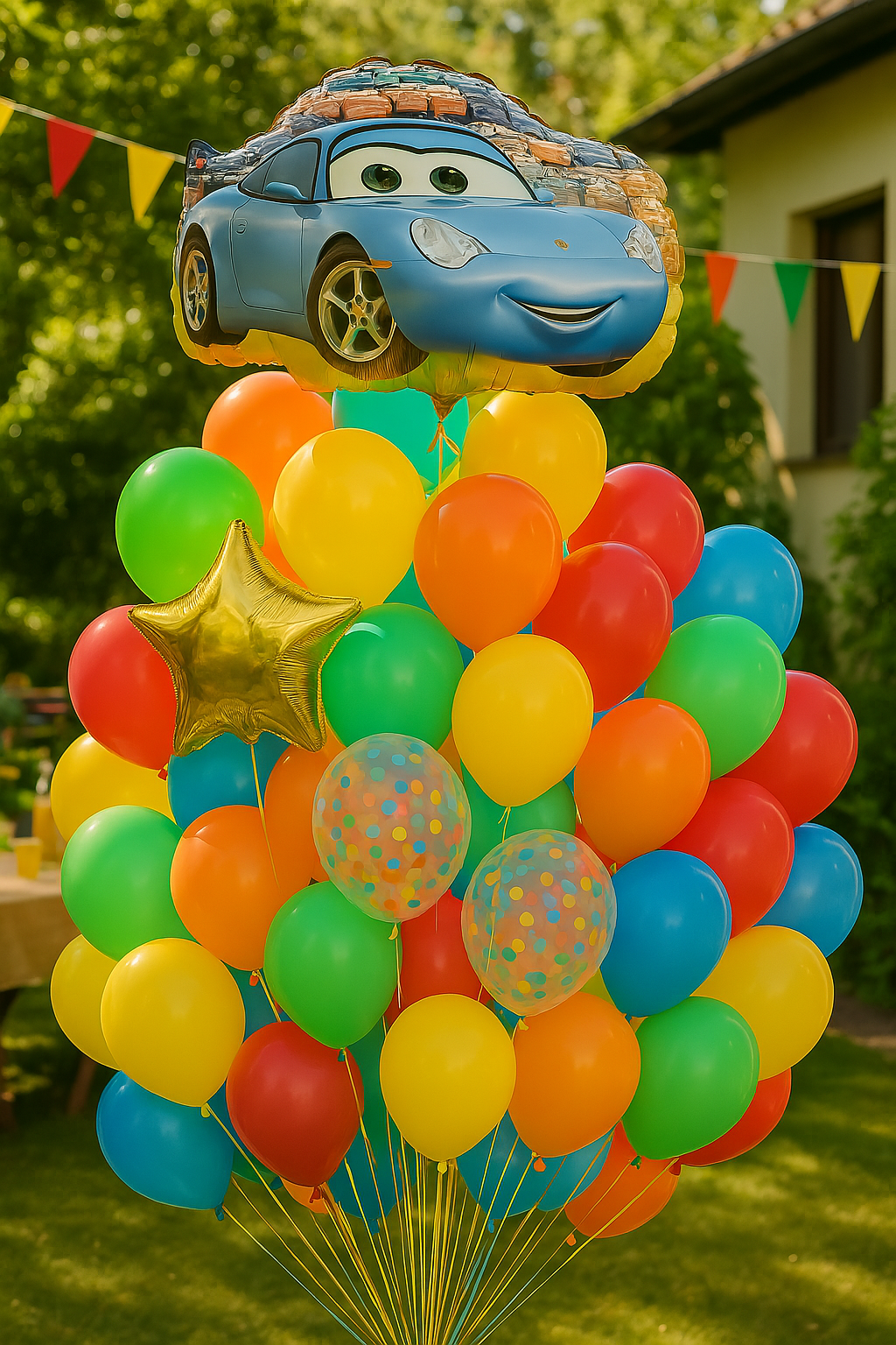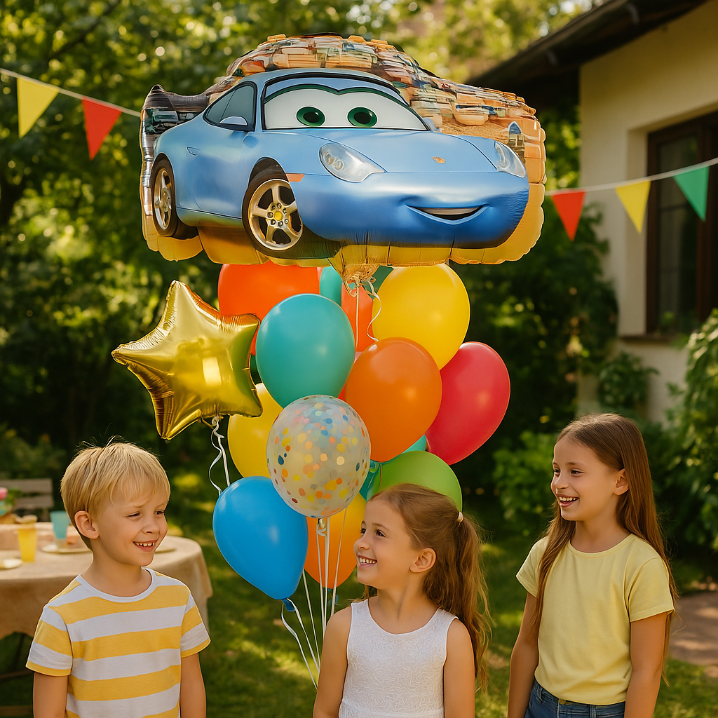 Fóliový balonek ve tvaru auta s velkýma očima, který znázorňuje jednu z postaviček z oblíbeného animovaného filmu "Auta". Balónek má modrou barvu a detaily připomínající skutečné auto, jako jsou světlomety, kola a usmívající se obličej. V pozadí jsou vidět tribuny, což naznačuje, že jde o scénu ze závodu. Ideální pro tematické oslavy pro děti a filmové fanoušky "Automobily".