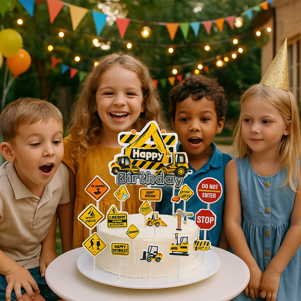 Představujeme sadu dekorativních dortových polev se stavebním motivem, které dodají zvláštní nádech každé narozeninové oslavě! Sada obsahuje barevné nápisy a symboly typické pro staveniště, například: "Happy Birthday" s bagrem, "Construction Zone", "Caution Party Zone", "Party This Way", "Stop", "Do Not Enter" nebo "Birthday Zone". Nechybí ani miniaturní stavební vozidla - jeřáb, bagr a vysokozdvižný vozík. Toppery jsou vyrobeny z vysoce kvalitních materiálů, takže vypadají nápadně a jsou bezpečné. Ideální pro dort pro malé stavební nadšence!