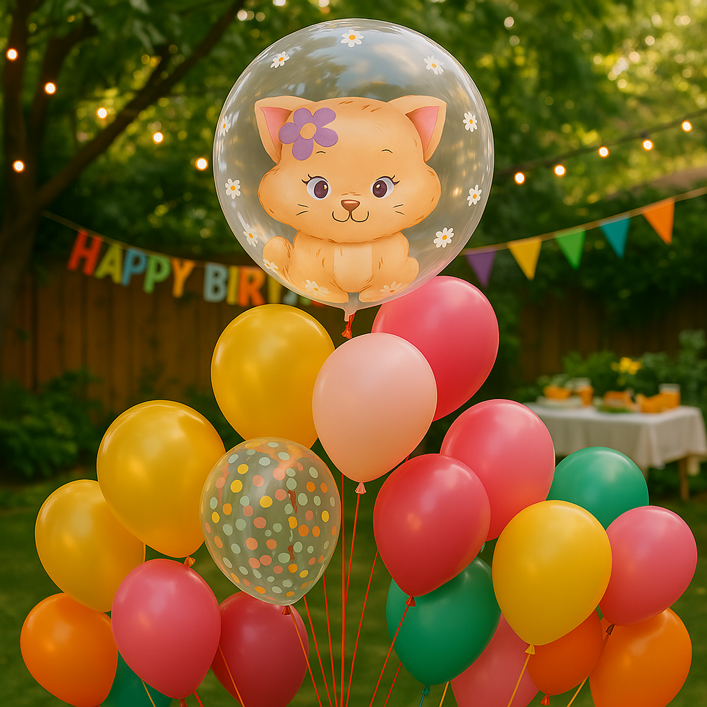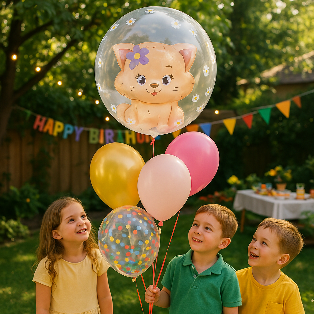 Průhledný fóliový balónek kulatého tvaru, zdobený bílými květy. Uvnitř balónku je pastelově zbarvená zvířecí postavička, která mu dodává půvab a je ideální pro různé příležitosti, jako jsou narozeniny, dětské oslavy a další večírky. Balónek je vybaven ventilem pro snadné plnění heliem nebo vzduchem.