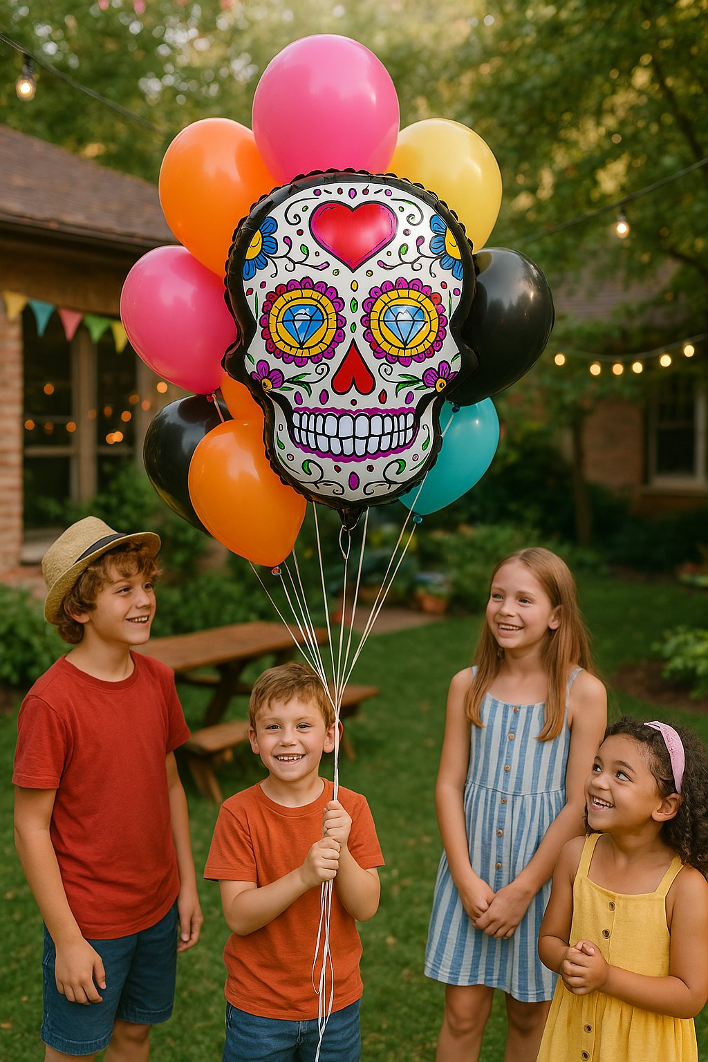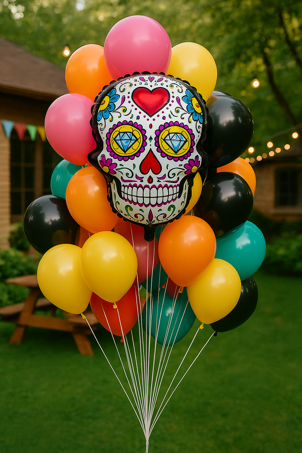 Fóliový balónek ve tvaru lebky, který upoutá pozornost svým jedinečným barevným designem. Na balonu dominují zářivé barvy, jako je červená, modrá, růžová a žlutá, které vytvářejí atraktivní a umělecký motiv. Design obsahuje květinové prvky a srdce na čele lebky, což balónku dodává jedinečný vzhled. Ideální doplněk pro tematické večírky, jako je Halloween, Día de los Muertos nebo jiné akce, kde záleží na výzdobě.