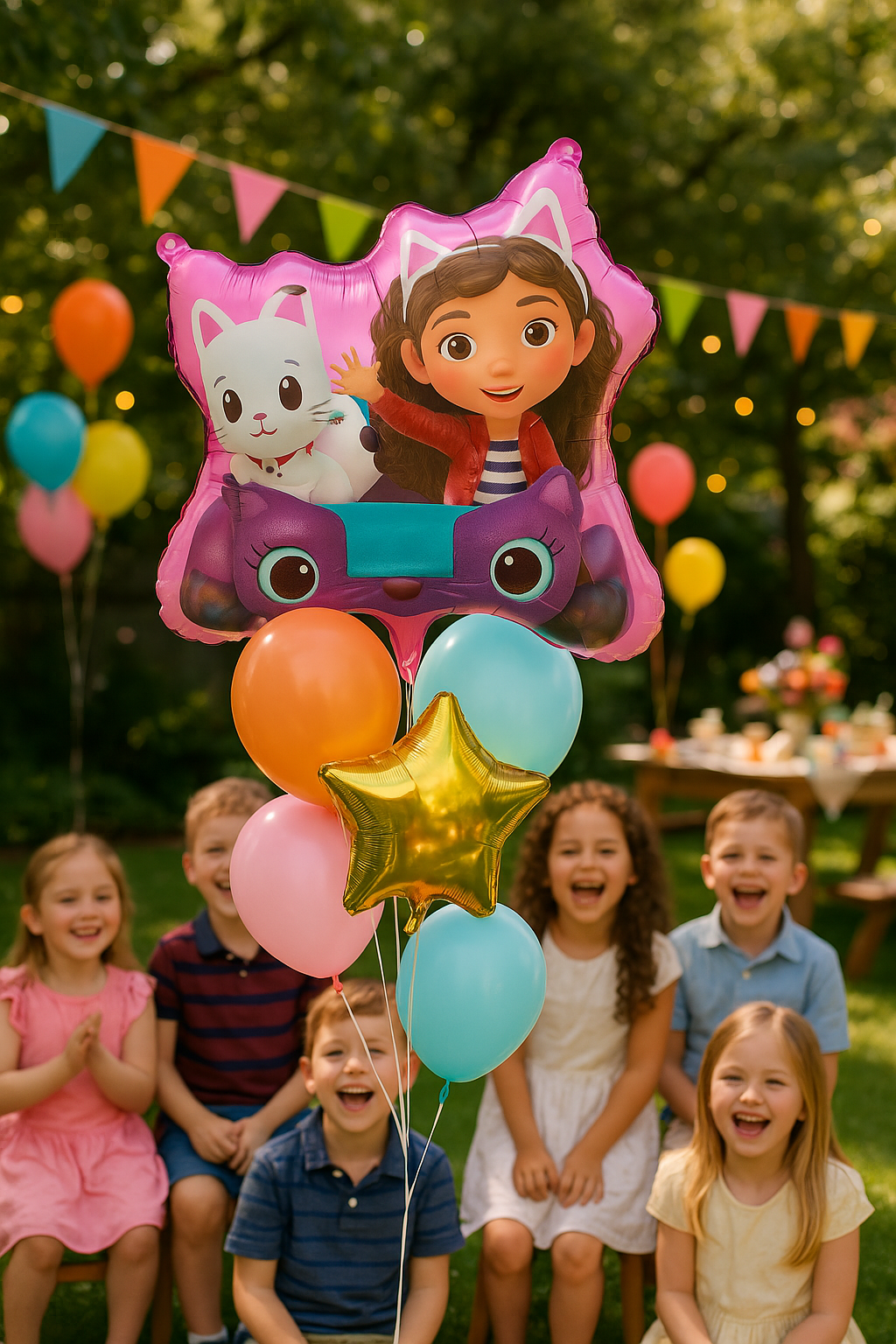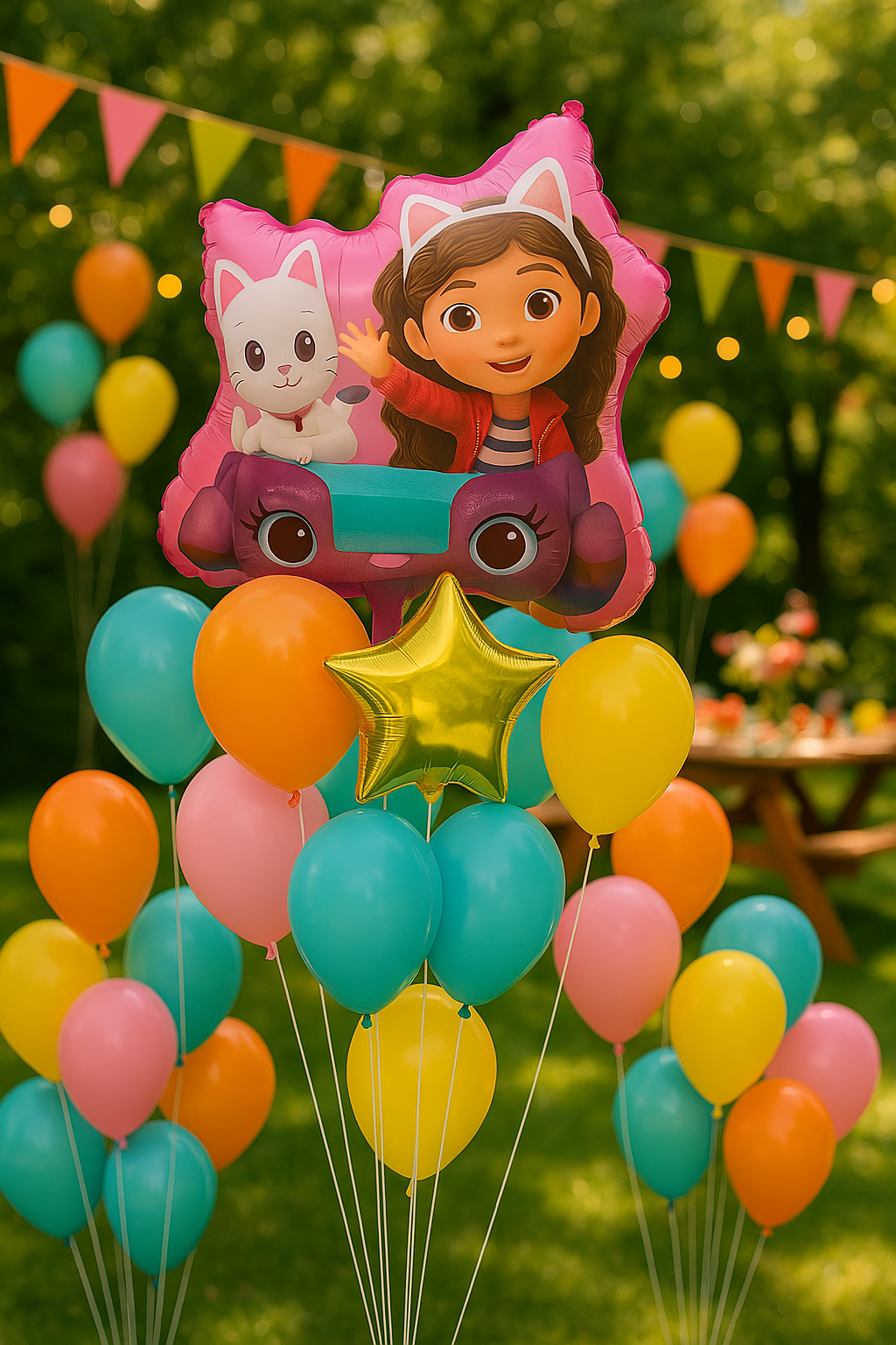 Fóliový balonek má čtvercový tvar se zaoblenými rohy a je zdoben postavičkami ze seriálu Dům kočky Gabi. Na balónku je Gabi, dívka s dlouhými tmavými vlasy, která má na sobě červený svetr a pruhované tričko, a bílá kočka s velkýma očima. Pozadí balónku je růžové a ve spodní části je fialový prvek připomínající kočičí obličej s velkýma očima. Balónek je ideální pro tematické oslavy, narozeniny nebo jiné speciální události pro fanoušky série "Dům kočky Gabi"".