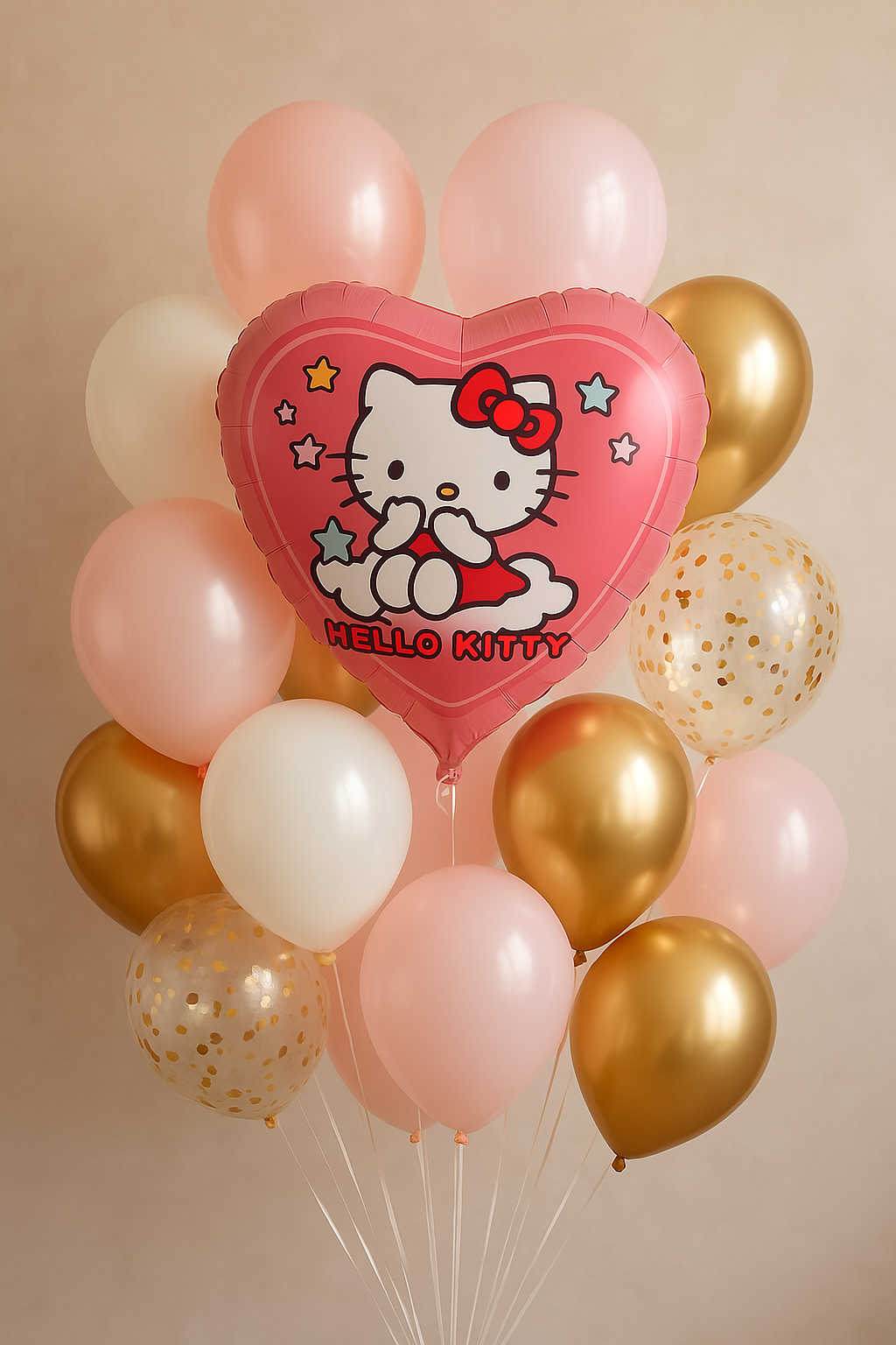 - Fóliový balónek ve tvaru srdce s motivem Hello Kitty, velikost 18 palců.