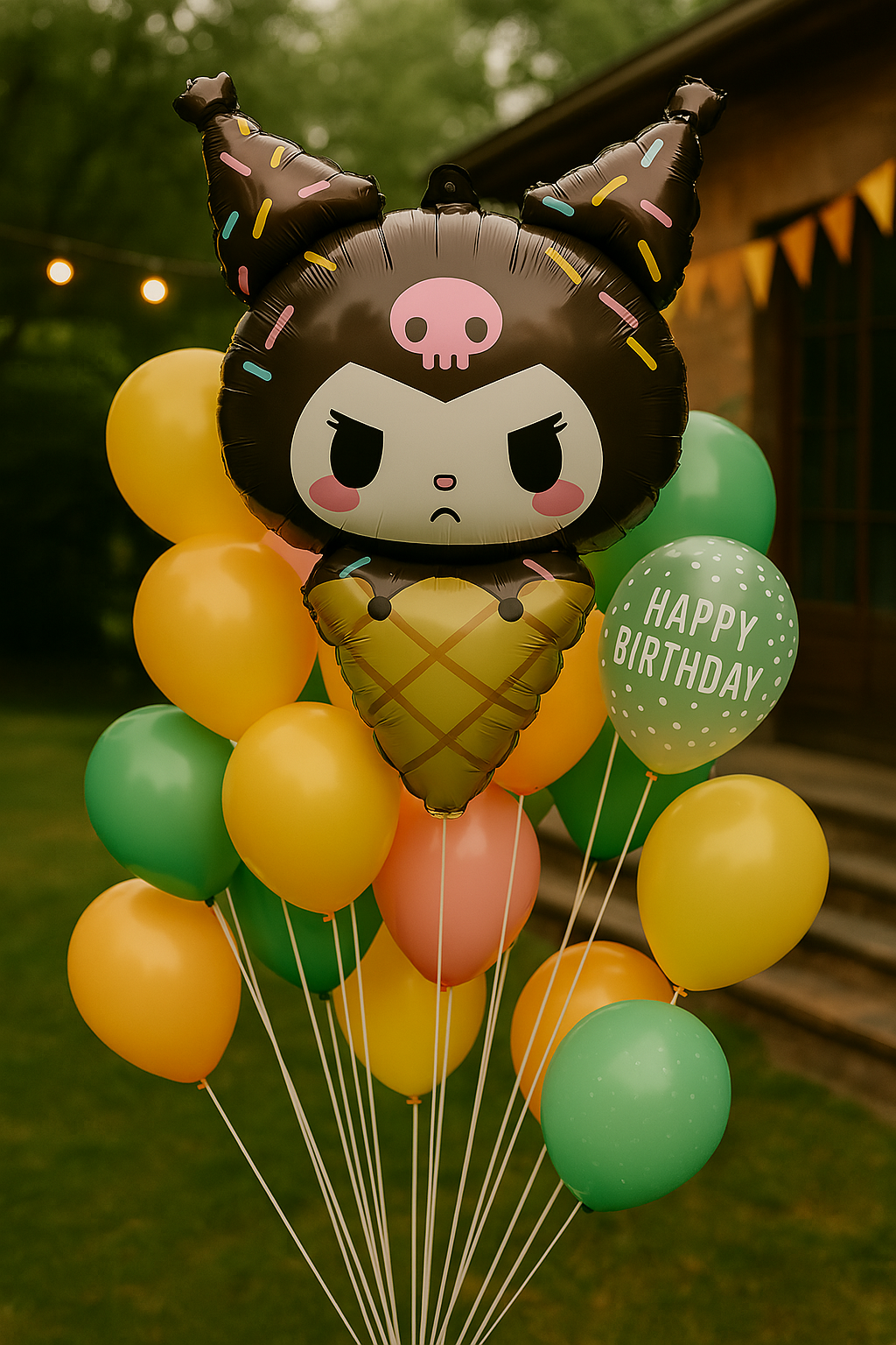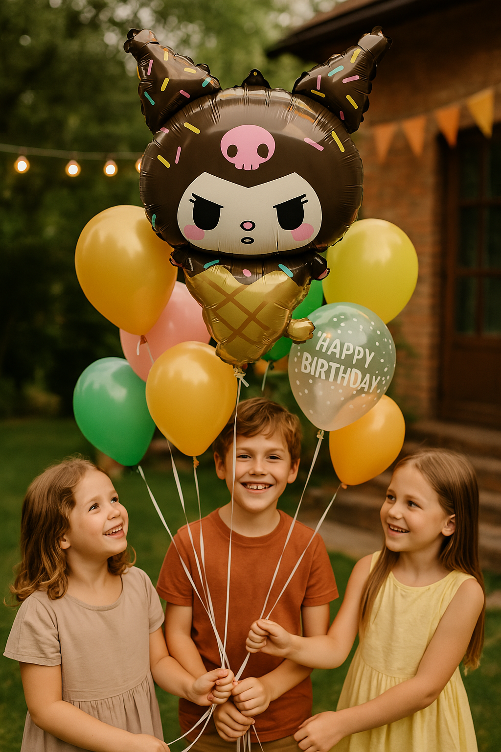 Fóliový balónek ve tvaru hlavy postavičky Kuromi ze série Sanrio. Balónek je tmavé barvy s růžovými tvářemi, bílýma očima a růžovým symbolem lebky na čele. Uši balónku jsou zdobeny barevným posypem, což mu dodává na půvabu. Balónek drží zlatou hvězdu s kostkovaným vzorem. Je to dokonalá dekorace pro tematické oslavy, narozeniny nebo jiné zvláštní příležitosti pro fanoušky postaviček Kuromi.
