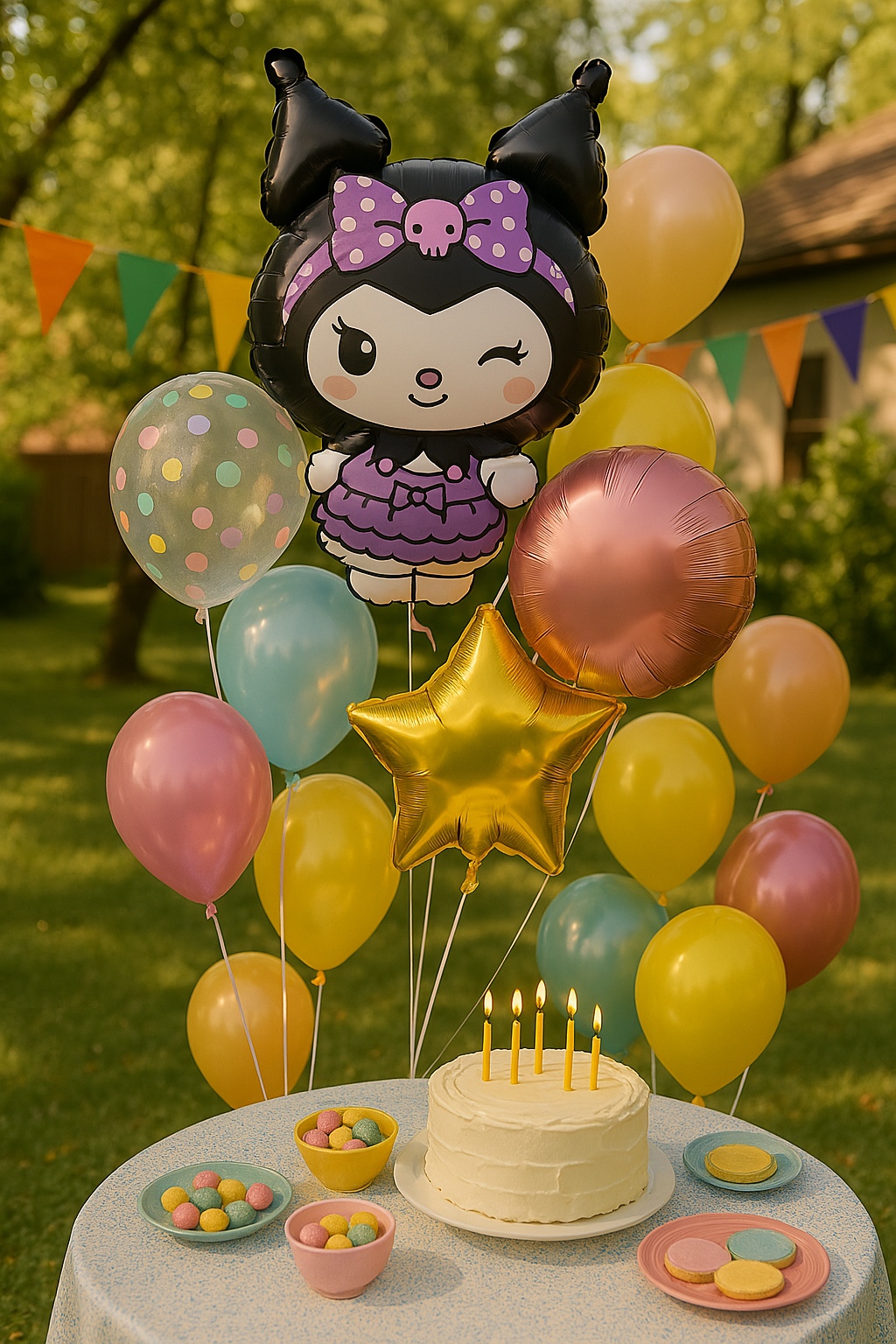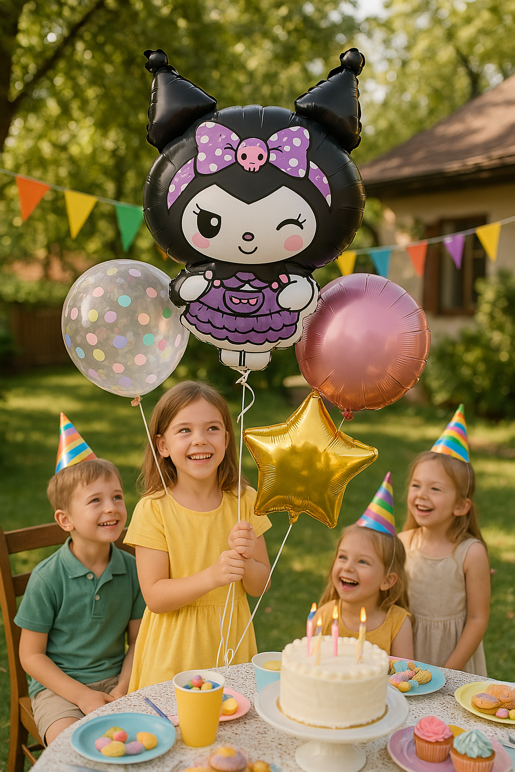 Na fóliovém balónku je vyobrazena postava Kuromi, jedna z oblíbených postaviček ze série Sanrio. Kuromi má výrazné černé uši s růžovými akcenty a na hlavě nosí fialovou mašli s bílými puntíky a růžovou lebkou uprostřed. Její oblečení se skládá z fialových šatů s volánky a růžovými detaily. Balónek je ideální pro různé příležitosti, jako jsou narozeniny, tematické oslavy nebo jako dekorace do místnosti.