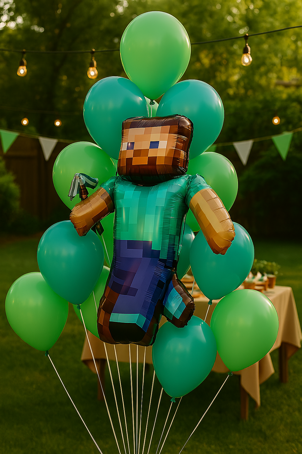 Fóliový balónek zobrazuje Steva, jednu z hlavních postav populární hry Minecraft. Balón má výrazný pixelový vzhled, typický pro grafiku hry, a je oblečen do modrozeleného oblečení. Steve drží krumpáč, který je jedním z nástrojů používaných ve hře ke kopání a sbírání surovin. Balónek je ideální pro tematické oslavy, narozeniny nebo jako dekorace pro fanoušky Minecraftu.