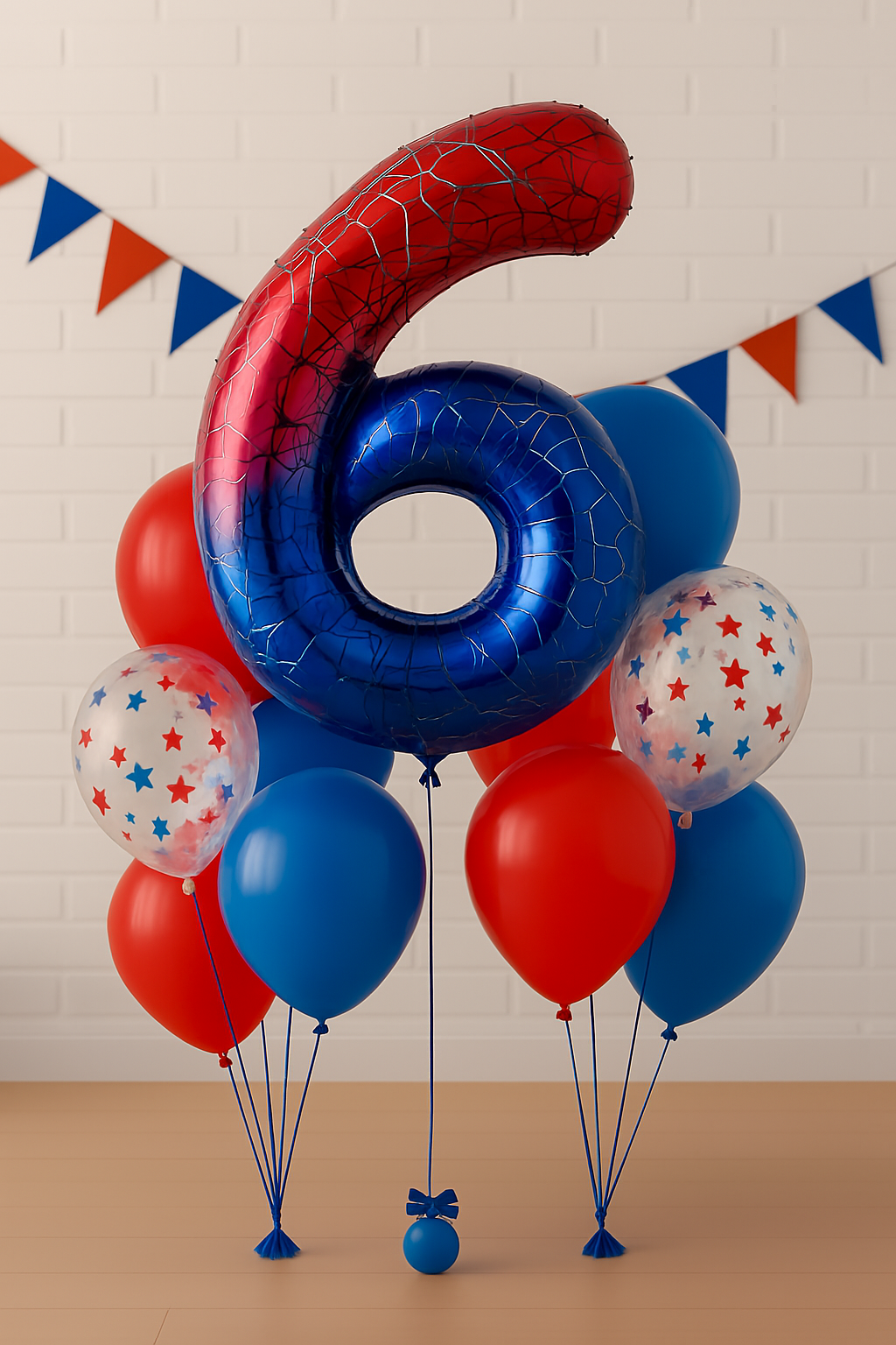 - Fóliový balónek číslo "6" Spider (100 cm) - velký fóliový balónek ve tvaru čísla 6, ideální pro číselné kompozice a dekorace k různým příležitostem.