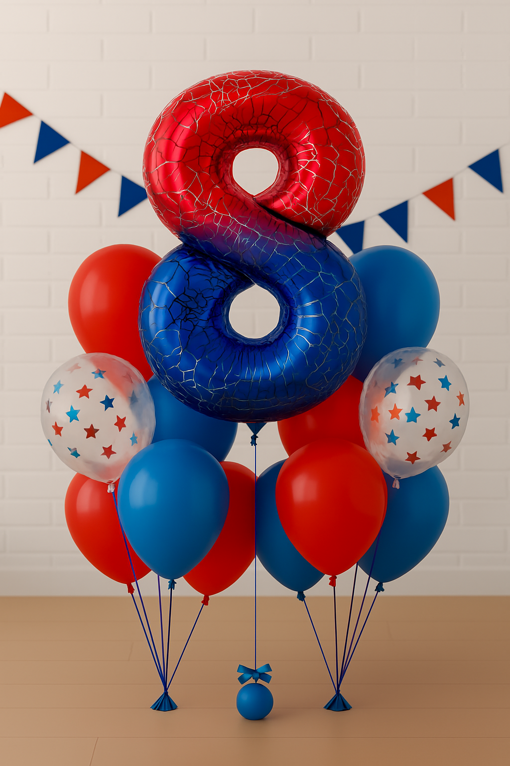 Fóliový balónek ve tvaru čísla 8. Balónek je zdoben motivem pavučiny, což mu dodává jedinečný vzhled. Barvy balónku přecházejí z červené nahoře do modré dole a vytvářejí tak gradientní efekt. Pavučiny jsou bílé a černé, což dodává balónku kontrast a činí ho vizuálně ještě přitažlivějším. Takový balónek může být dokonalým doplňkem pro tematické večírky, narozeniny nebo jiné zvláštní příležitosti.