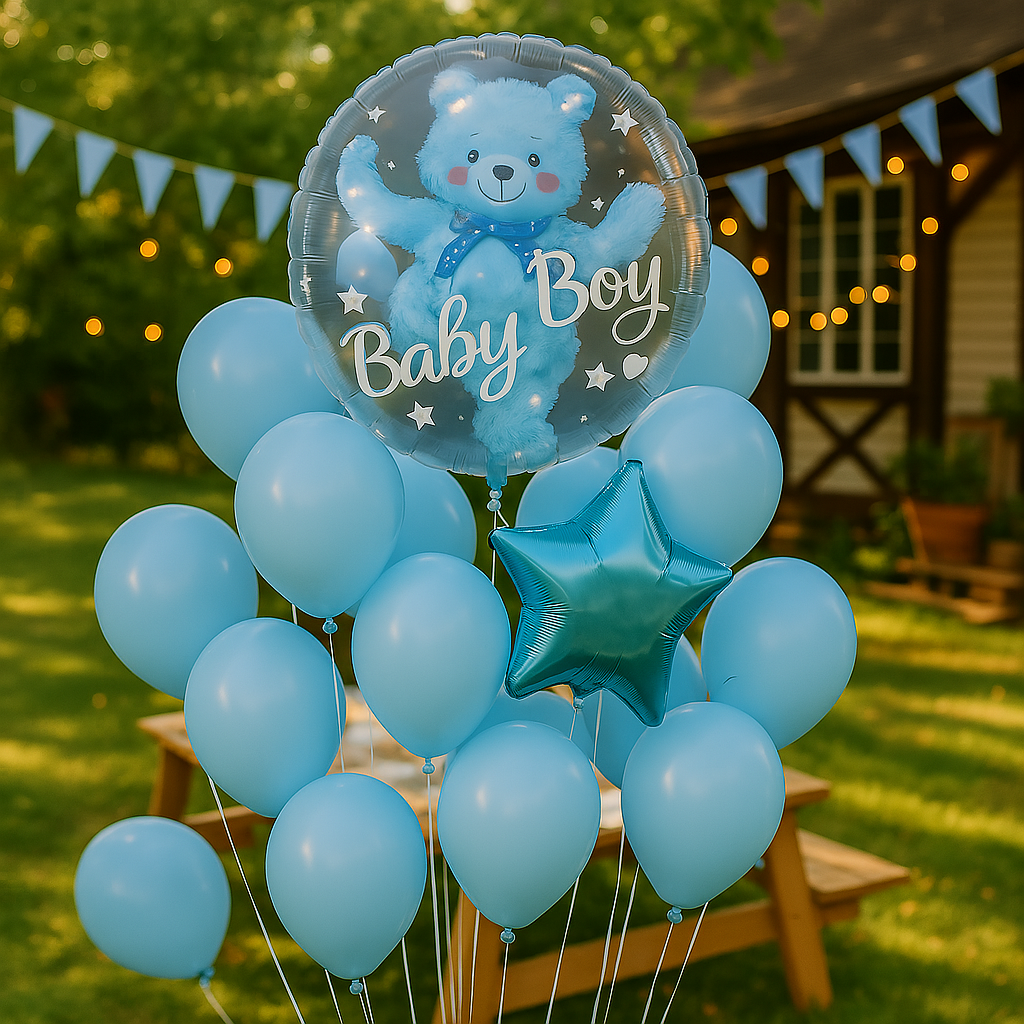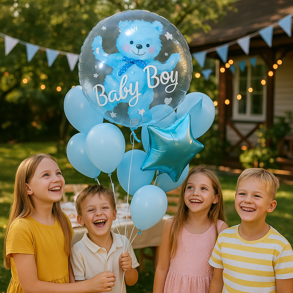 Představujeme rozkošný fóliový balónek s nápisem "Baby Boy", ideální pro chlapecké narozeninové oslavy. Balónek je kulatý, průhledný, s obrázkem modrého medvídka uprostřed. Medvídek má růžové tváře, usmívá se a nosí modrou mašli s bílými puntíky. Medvídka obklopují bílé hvězdičky a srdíčka, což balónku dodává na půvabu. Balónek je ideální pro výzdobu dětského pokoje nebo jako dárek k dětské oslavě.