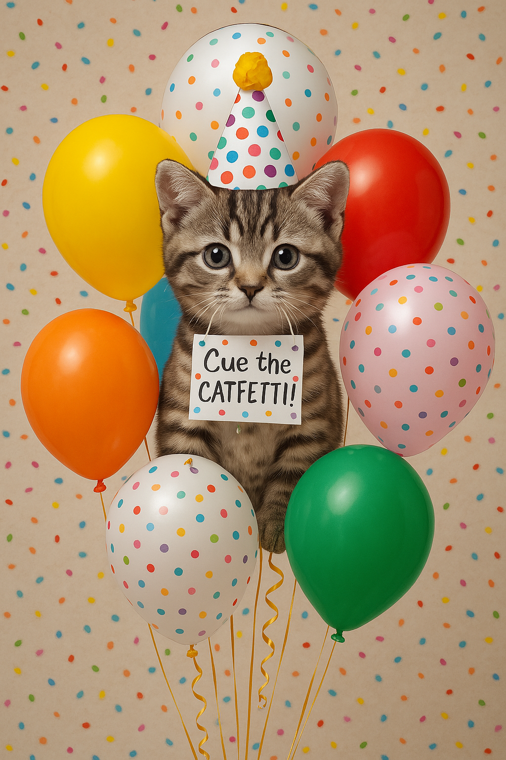 - Fóliový balónek o rozměrech 36 cm x 69 cm, na kterém je vyobrazena kočka v párty klobouku s nápisem "Cue the CATitude"!".