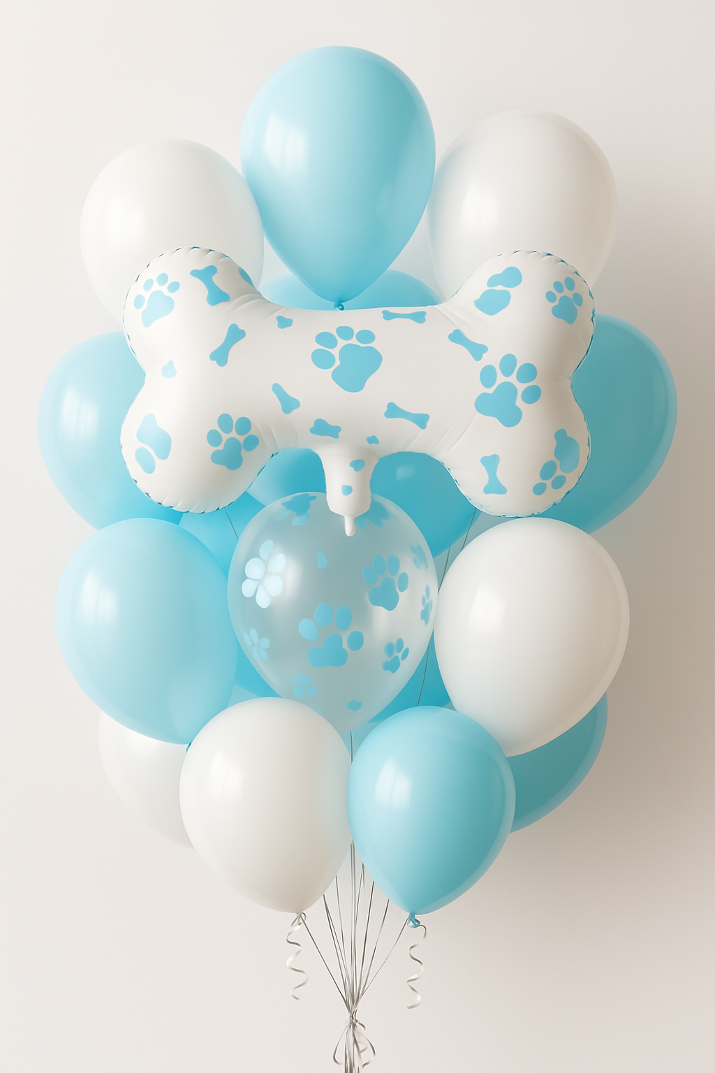 - Bílý fóliový balónek ve tvaru kosti, zdobený modrými tlapkami. Ideální pro akce se zvířecí tematikou!