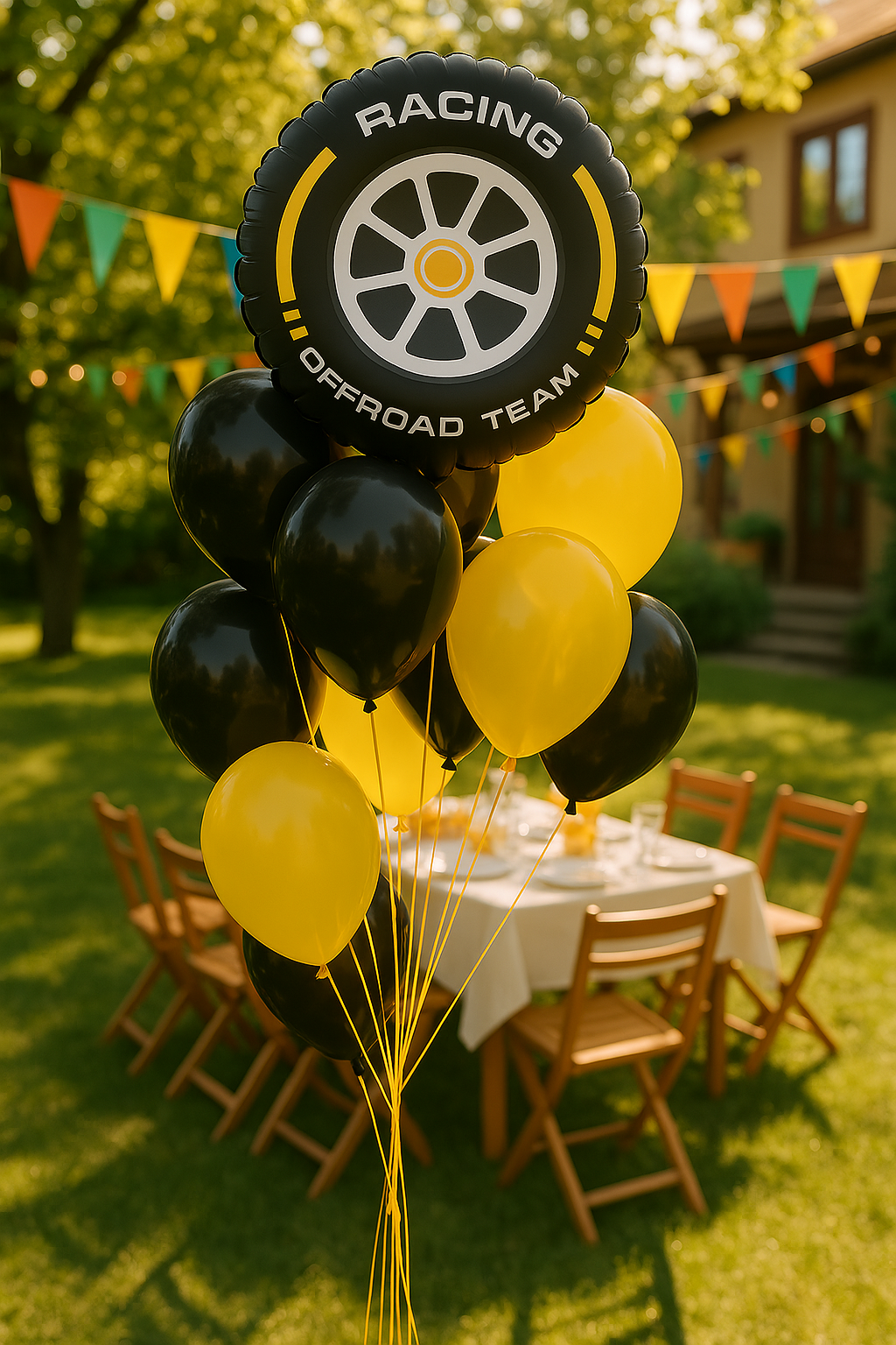 Tento fóliový balónek znázorňuje stylizované závodní kolo s bílými a žlutými akcenty, které napodobují ráfek automobilu. V horní části balonu je nápis "RACING" a ve spodní části "WORLDWIDE TEAM". Balónek je černý s dynamickými detaily, takže je ideální na oslavy s tématikou automobilových závodů nebo jako dekorace pro fanoušky motoristického sportu.