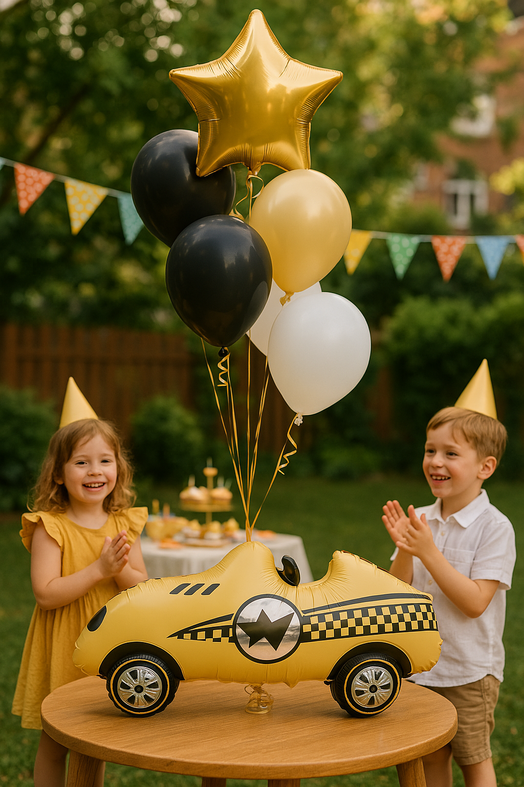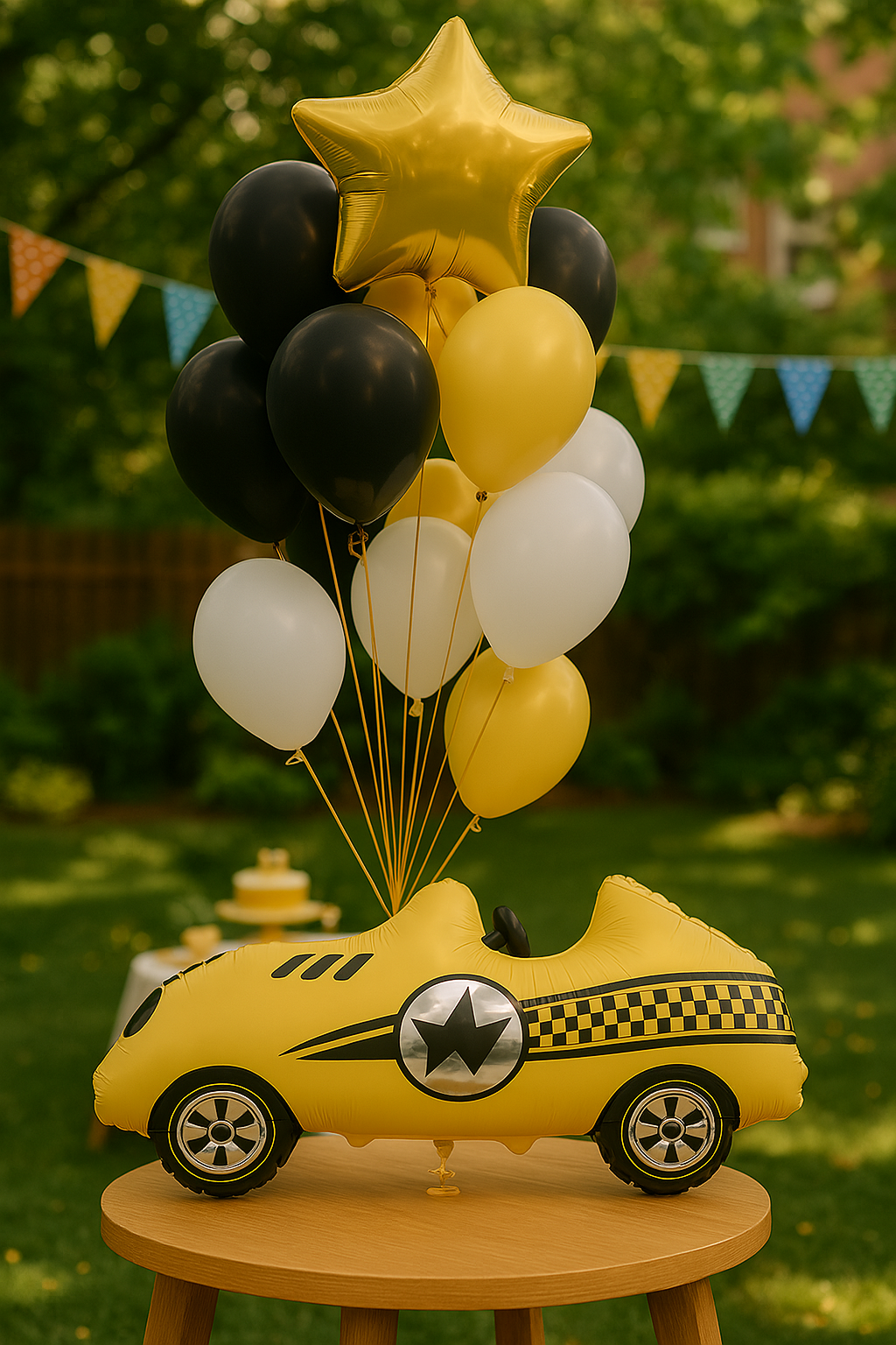 - Fóliový balónek ve tvaru žlutého závodního auta s černobílými detaily o rozměrech 100x45x20 cm.