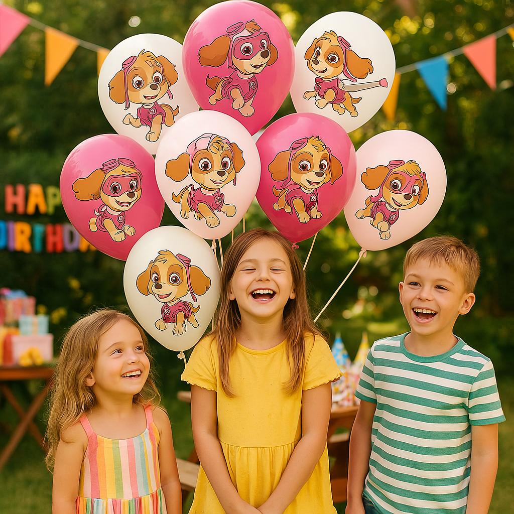 Sada balónků v různých odstínech růžové a bílé barvy zdobených obrázkem Skye, jedné z hlavních postav oblíbeného kresleného seriálu "Psí hlídka". Skye je vyobrazena v různých pózách a oblečcích, takže balónky zaujmou děti, které jsou fanoušky této postavy. Tyto balónky mohou být dokonalým doplňkem narozeninových oslav, tematických večírků nebo jiných dětských akcí.