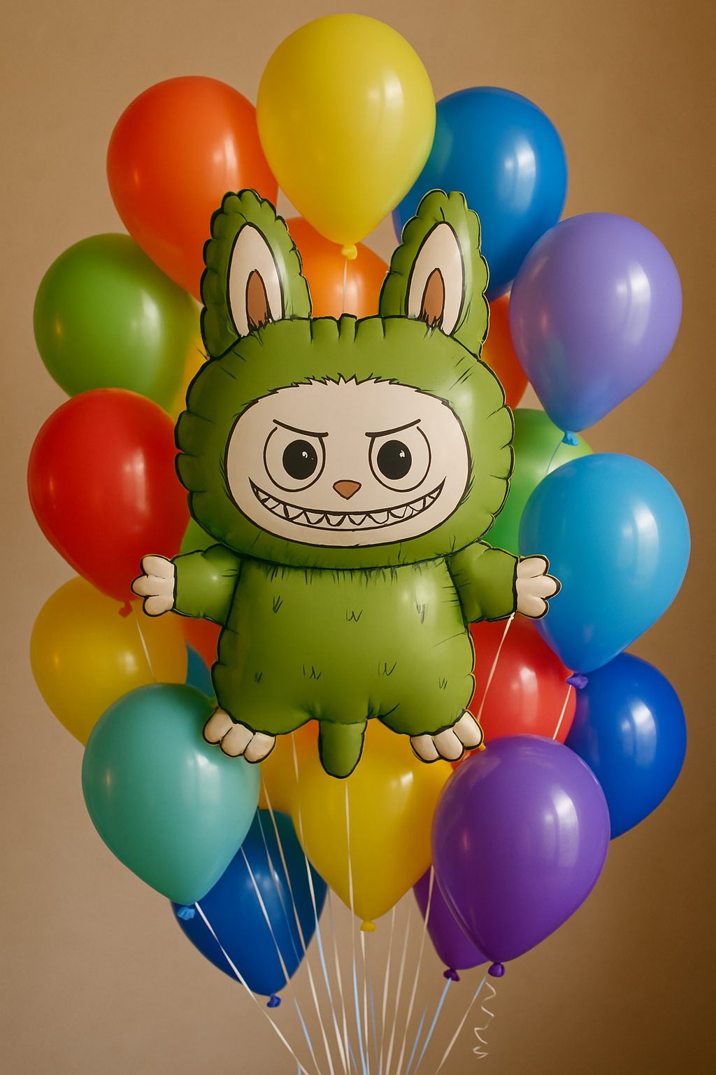- Fóliový balónek Labubu o rozměrech 68x38 cm se zelenou kreslenou postavičkou s velkýma ušima.