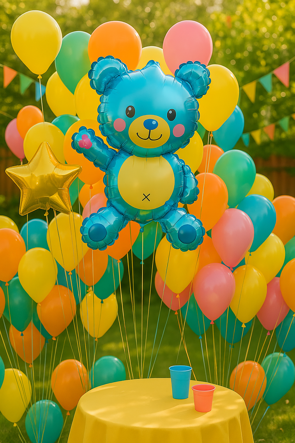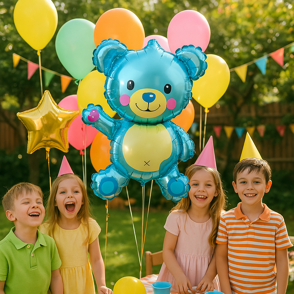 - Modrý fóliový balónek ve tvaru medvídka s růžovými tvářičkami a žlutým bříškem - ideální na dětské oslavy.