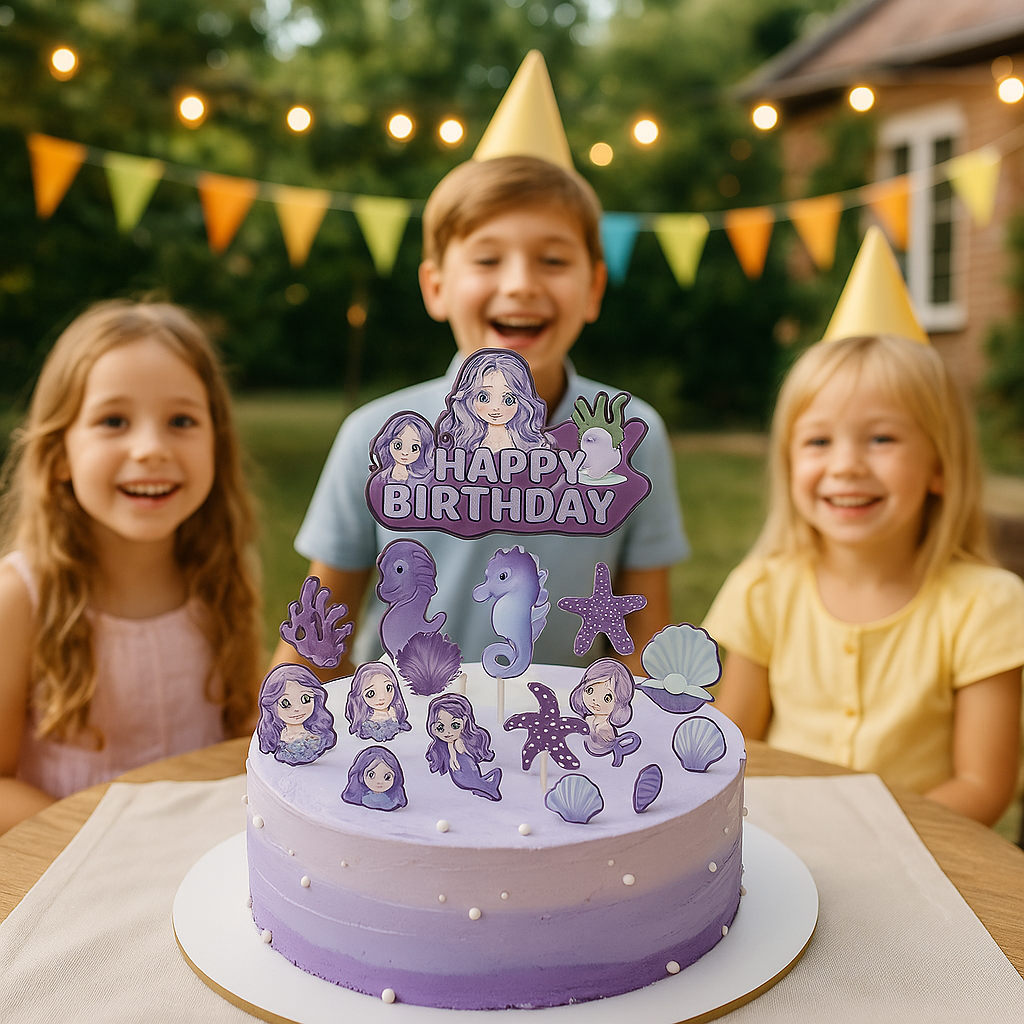 Proměňte obyčejný dort v opravdové umělecké dílo s našimi narozeninovými toppery mořské panny! Sada obsahuje barevné dekorace s roztomilými mořskými pannami, mořskými koníky, mořskými hvězdicemi, mušlemi a korálovými útesy - vše v nádherných odstínech fialové a modré. Ústředním prvkem kolekce je topper "Happy Birthday", zdobený mořskou pannou a podvodními rostlinami, který dodá každému dortu zvláštní nádech. Ideální volba pro námořnickou dobrodružnou párty pro děti i dospělé snílky.