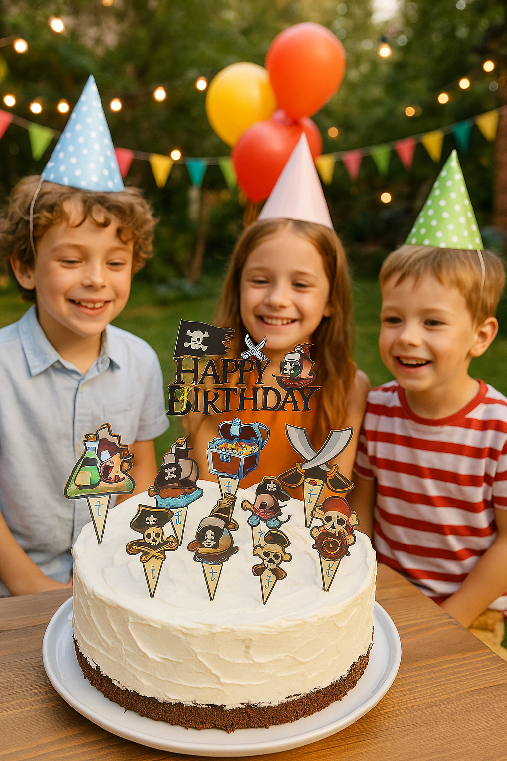 Přeneste svou narozeninovou oslavu do světa plného námořních dobrodružství s touto sadou pirátských dortových polev! Tato originální sada obsahuje sedm jedinečných dekorací: ústřední vršek s nápisem "Všechno nejlepší" a pirátskou lodí a šest menších dílků zobrazujících ikony pirátského života - truhlu s pokladem, láhev rumu, zkřížené šavle, lebku s kloboukem, lodní kormidlo a druhou loď. Každý topper je připevněn na stylovém párátku s motivem kotvy, takže dort snadno ozdobíte a potěšíte své hosty. Ideální volba pro tematické dětské oslavy, narozeninové párty pro fanoušky pirátských příběhů a všechny milovníky dobrodružství!