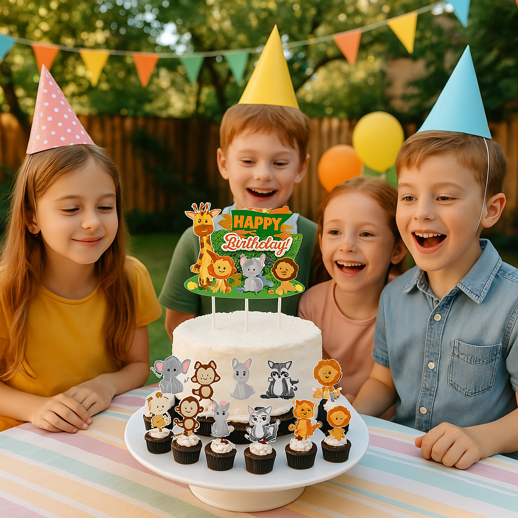 Přidejte na svou párty nádech divoké zábavy s našimi toppery s motivy tropických zvířat! Součástí jsou barevné ilustrace přátelských zvířat, jako je slon, opice, králík, tygr, lev a mýval, které se krásně vyjímají na dortících a koláčcích. Centrální nápis "Happy Birthday" obklopený zvířátky dodává celé dekoraci zvláštní slavnostní nádech.