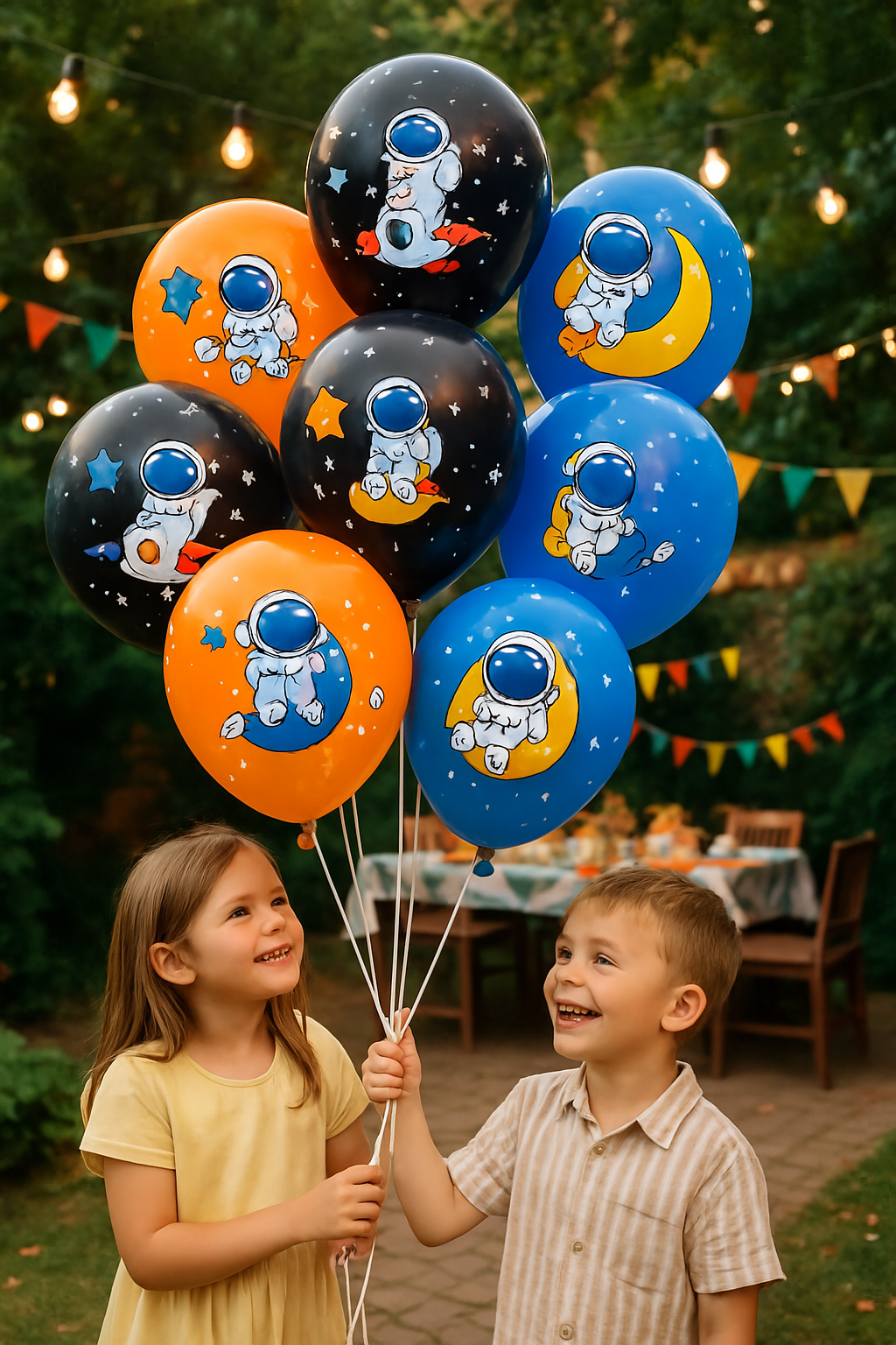 Set of 10 balloons in three colors: black, blue and orange, decorated with graphics of astronauts in space. Each balloon depicts an astronaut against a background of stars, rockets and planets, making them ideal for themed birthday parties, children's parties and space decorations. The balloons are made of high-quality latex for durability and long-lasting air retention. Add a cosmic flair to your event with these unique balloons!