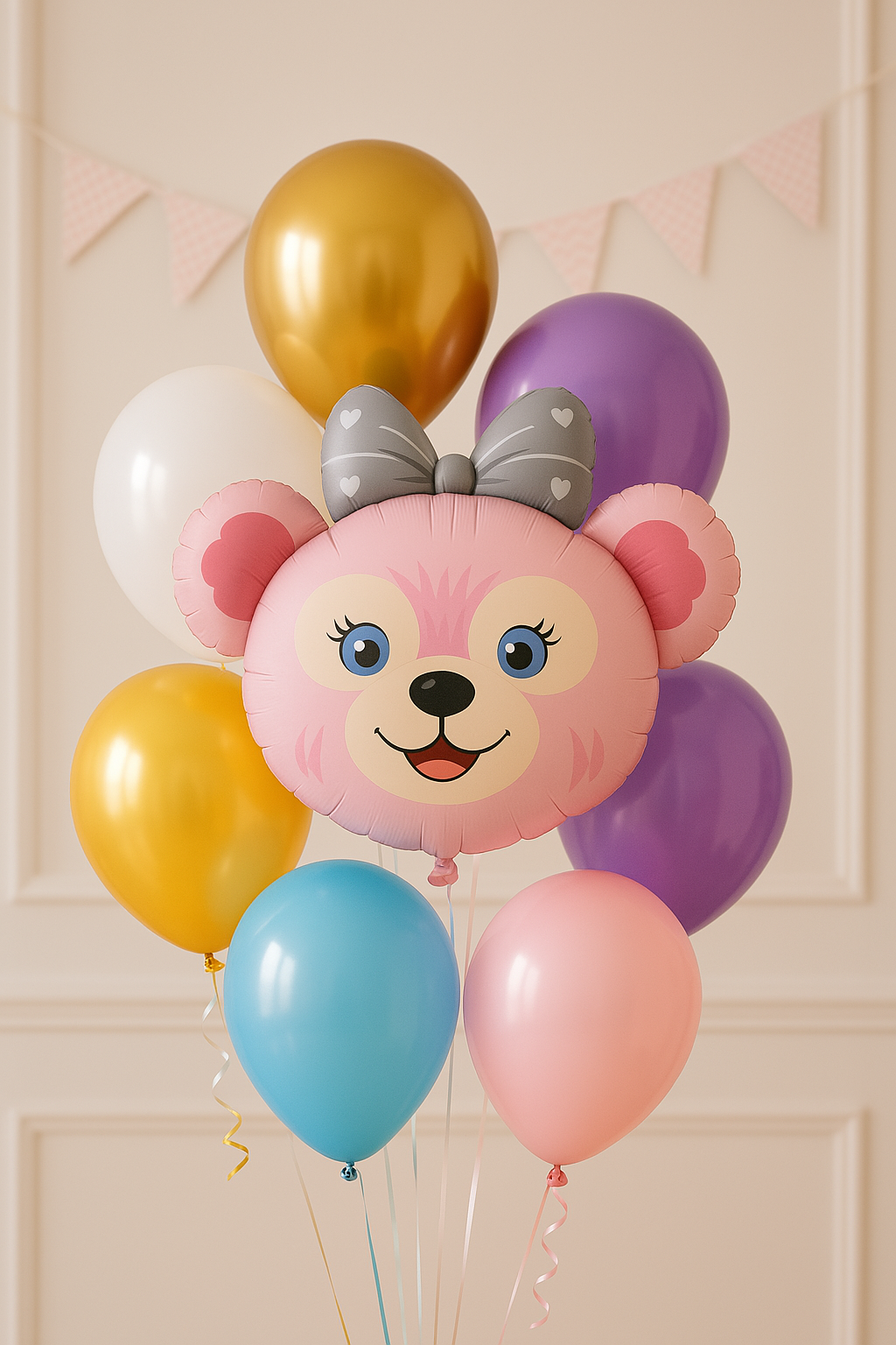 Foil balloon depicts a teddy bear with big pink ears and an elegant gray bow on its head. His cheerful expression, blue eyes and rosy cheeks add a unique charm that will delight children and adults alike. The 70x67 cm balloon will work well as a decoration for birthdays, baby showers, themed parties or other special occasions. It can be filled with air or helium, and its durability guarantees hours of enjoyment. This is the perfect way to enhance the atmosphere of any celebration!