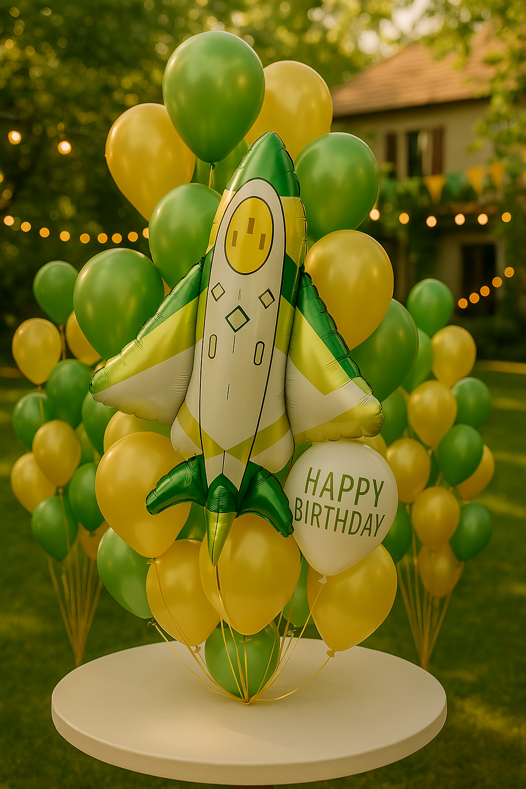- Foil balloon in the shape of an airplane with dimensions of 105x98 cm, in green, white and yellow colors.