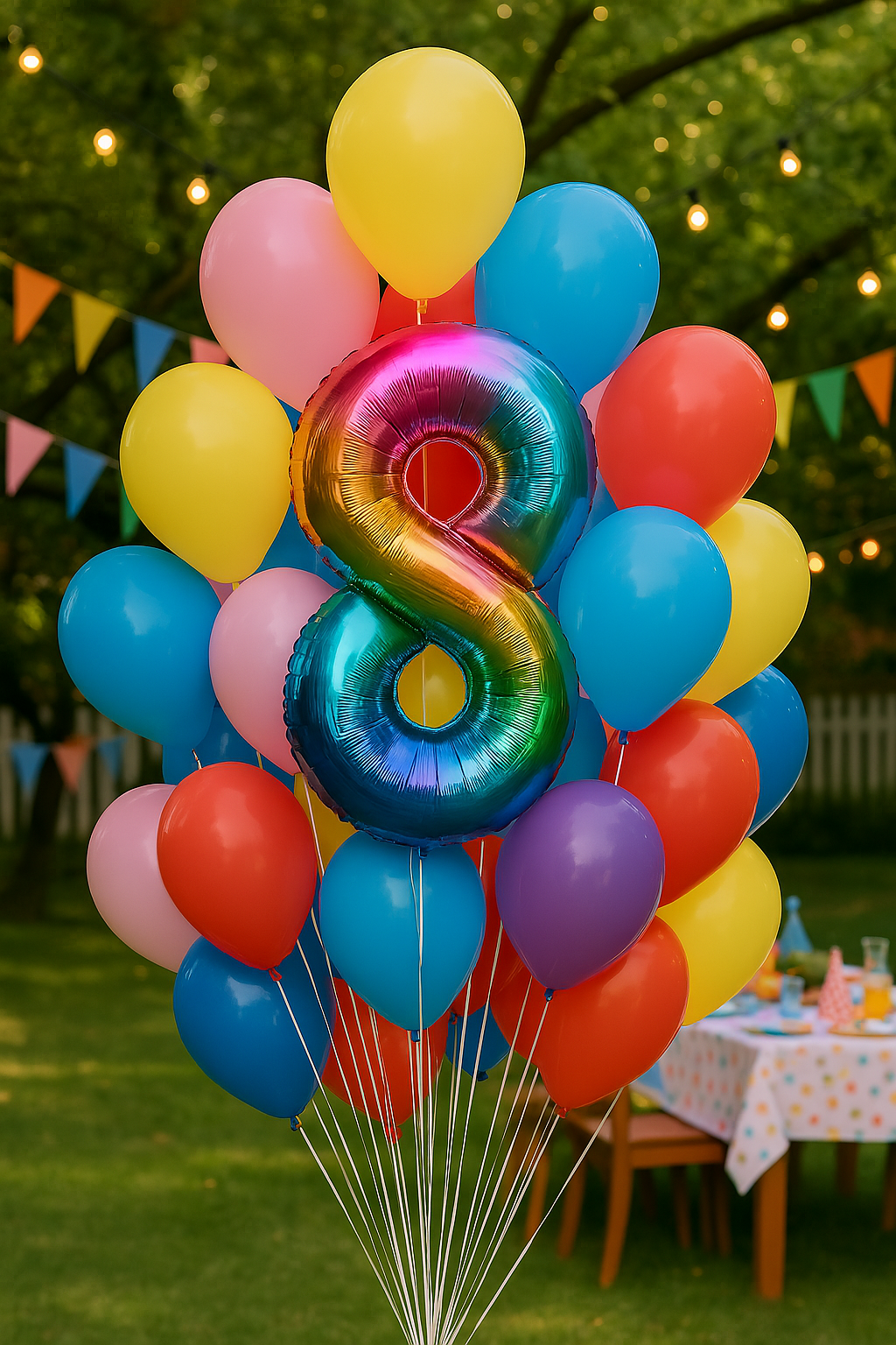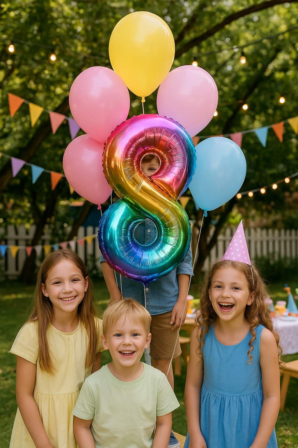 - Foil Balloon Number "8" Rainbow (100 cm) - large foil balloon number 8 with gradient effect, ideal for birthdays and other celebrations.