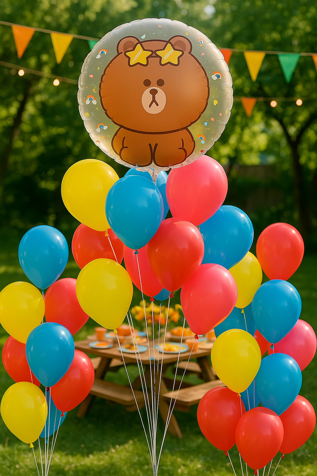 Foil balloon in the shape of a teddy bear, ideal for parties, birthdays and other occasions. The balloon has a transparent round form with colorful patterns in the background, and in the center is a cute brown teddy bear with stars on its head. The balloon is made of durable material for long-lasting use. An excellent addition to the interior decoration that is sure to attract the attention of guests and add charm to any event.