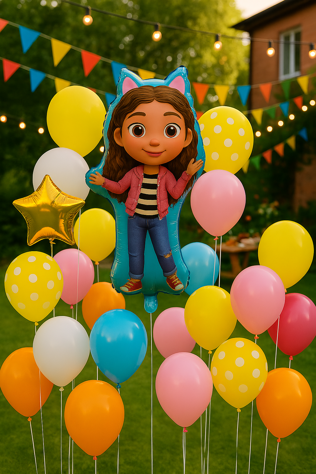 Foil balloon in the shape of the character Gabi from the cartoon "Gabi the Cat's House". The balloon has a blue background and depicts Gabi wearing a pink jacket, black and white striped blouse and blue pants. On her head Gabi is wearing a headband with cat ears. The balloon is ideal for birthday parties for children who are fans of the cartoon.