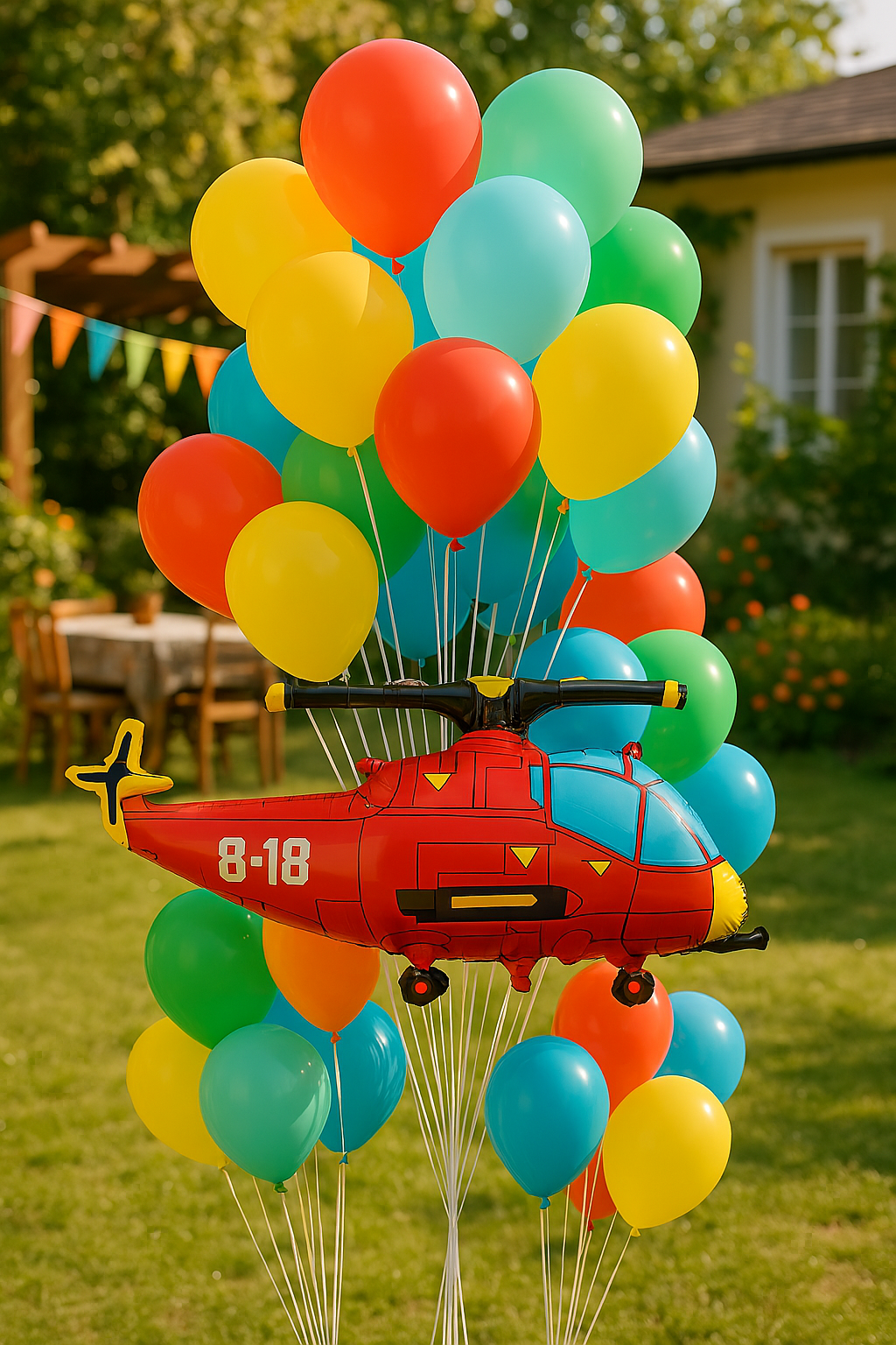 - Foil balloon in the shape of a helicopter, measuring 52x89 cm, in red with yellow and black details.