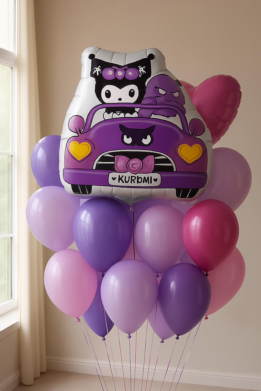 - Foil balloon with Kuromi character in a purple car, perfect for parties and decorations. Dimensions: 47 x 48 cm.