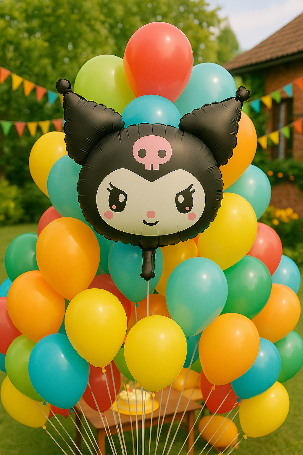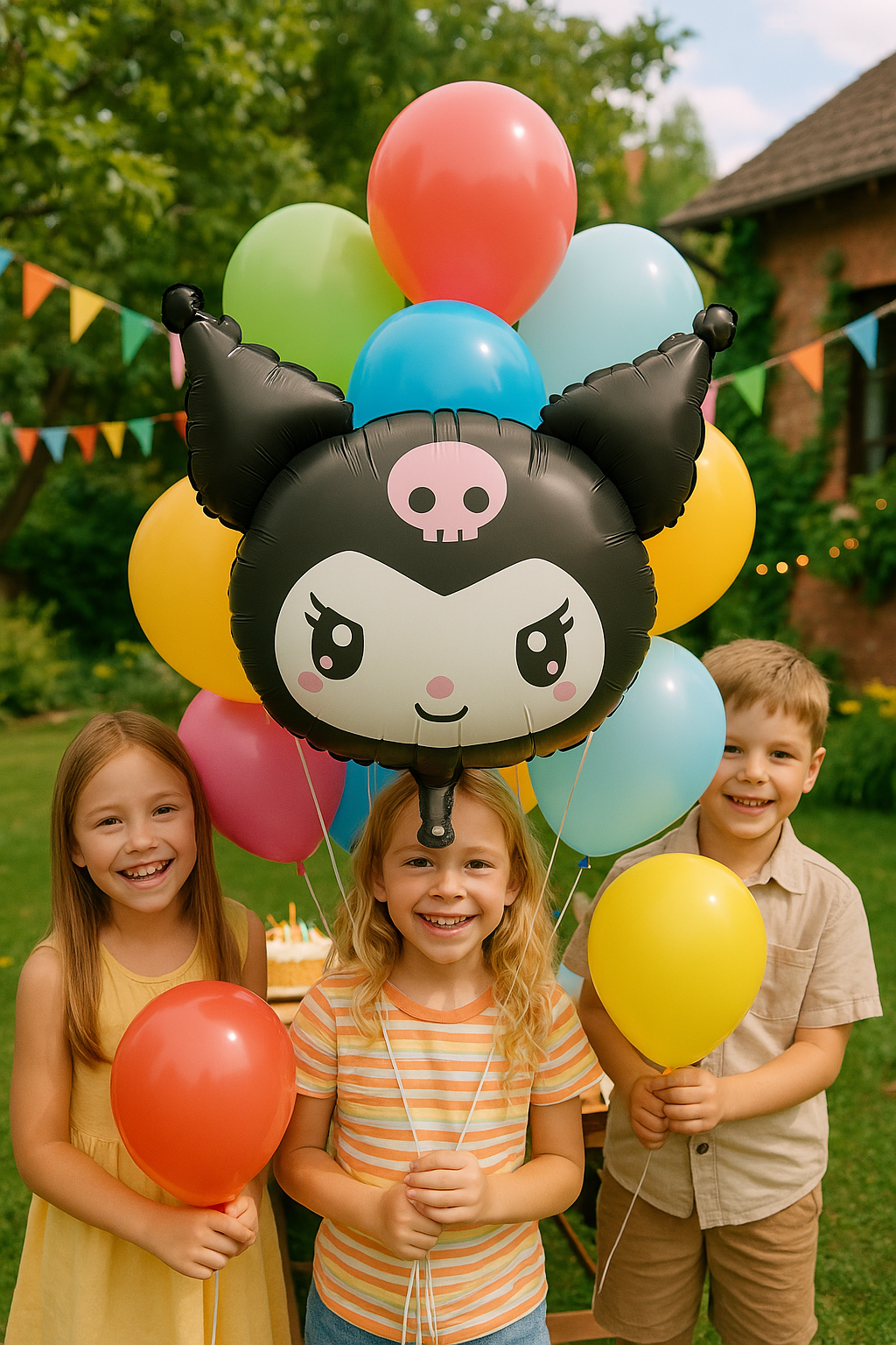 - Foil balloon in the shape of the head of Kuromi, a character from the Sanrio series, with a distinctive pink skull on the forehead. (67cm*63cm)