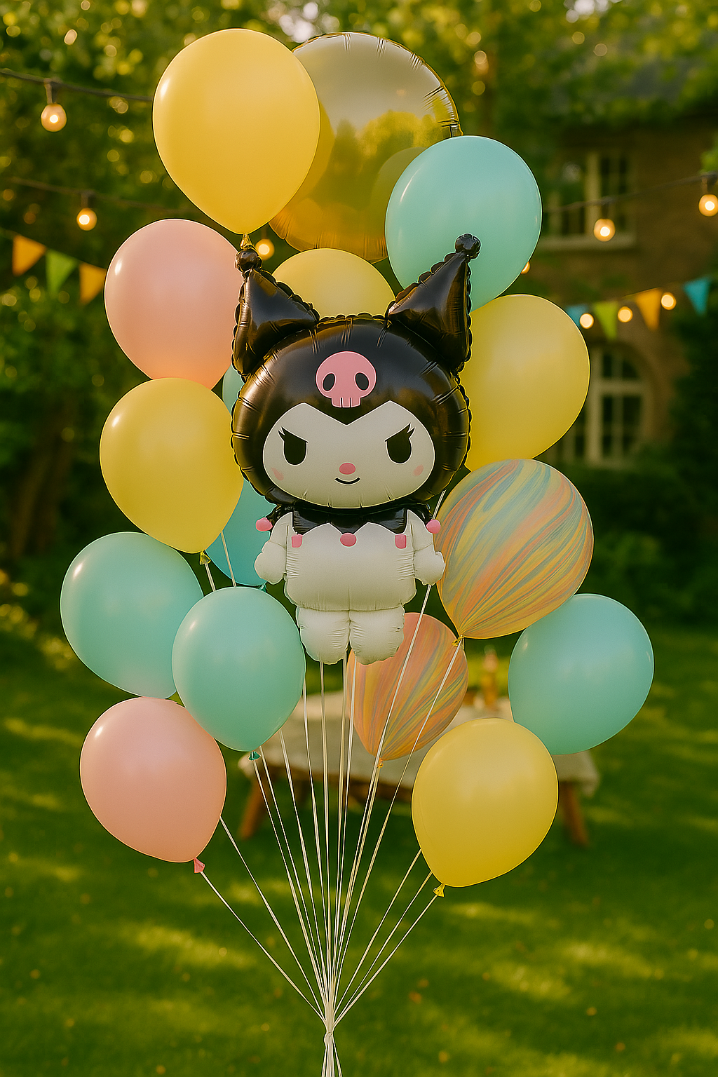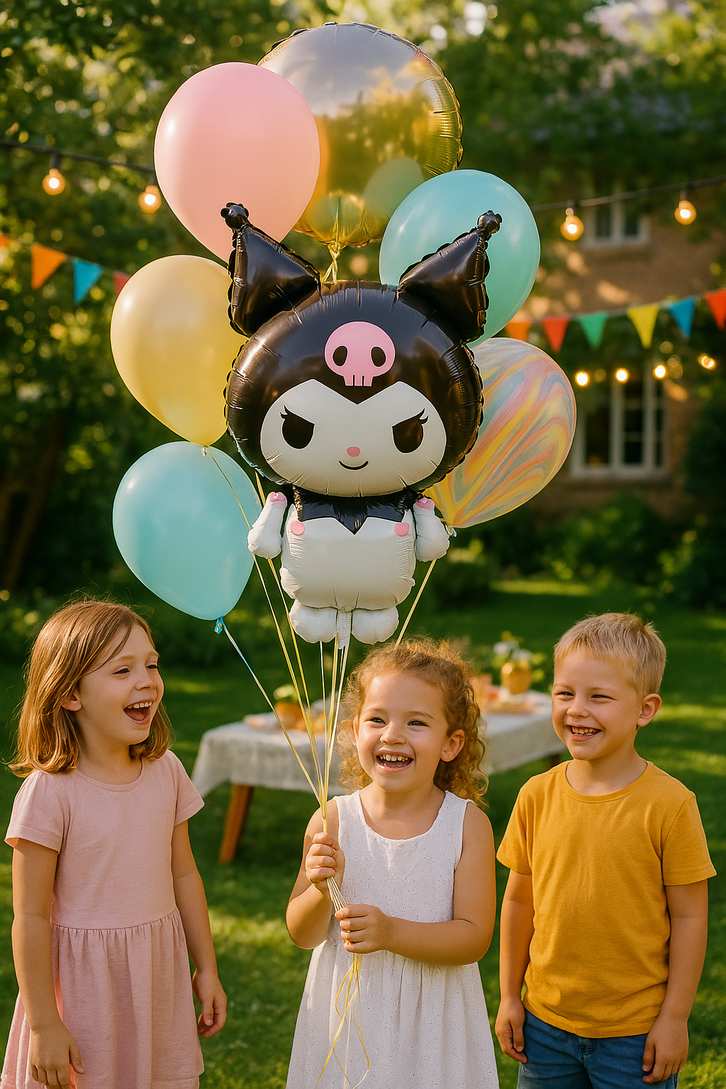 Foil balloon in the shape of Kuromi character, ideal for parties and decorations. The balloon depicts an adorable figure with large black ears, a pink skull on the forehead and a white body with pink accents. Made of high quality foil, the balloon is durable and easy to fill with helium or air. Perfect addition to birthdays, theme parties and other special occasions.