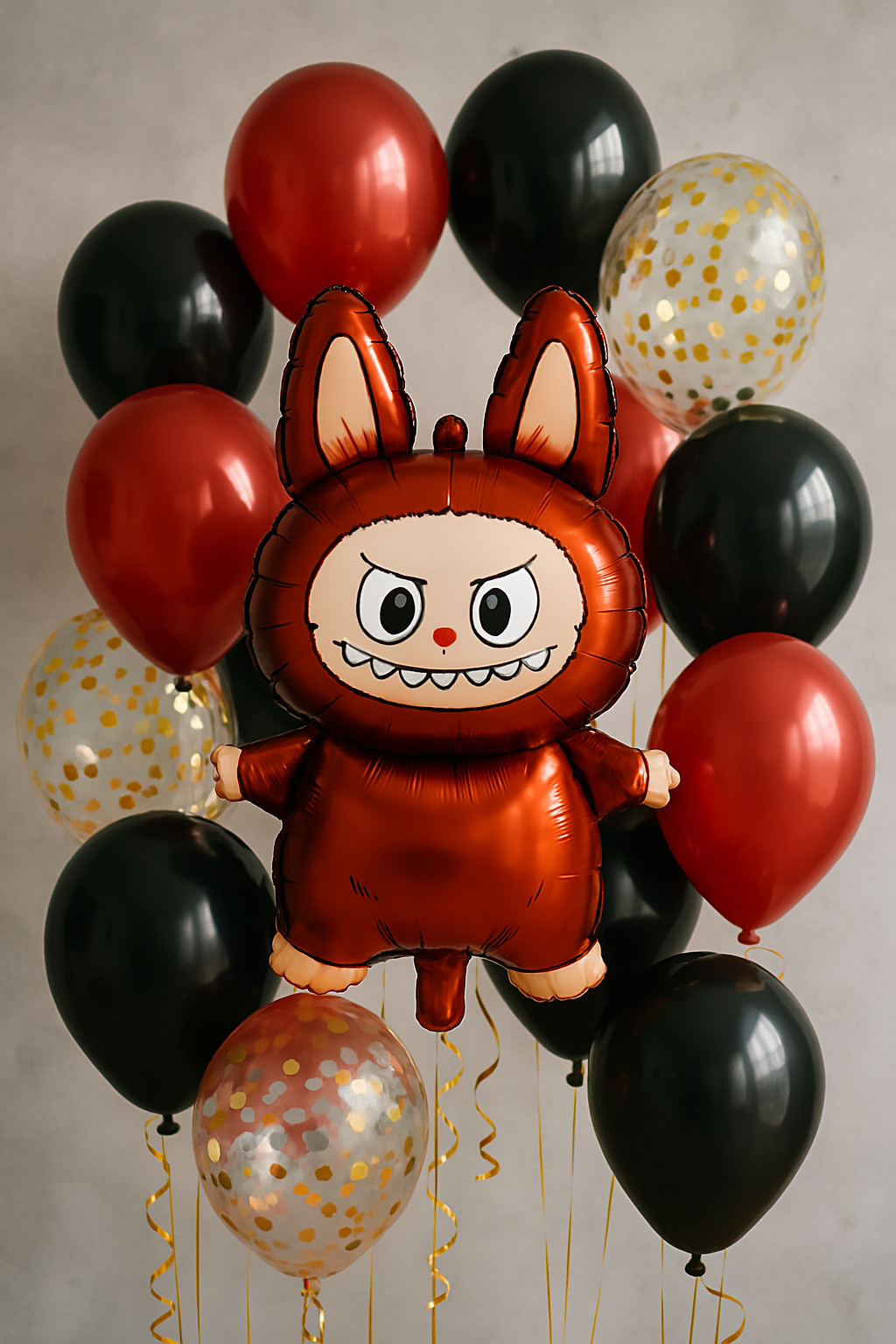 • A 68x38 cm Labubu foil balloon depicting a cartoon character in a red outfit with ears.