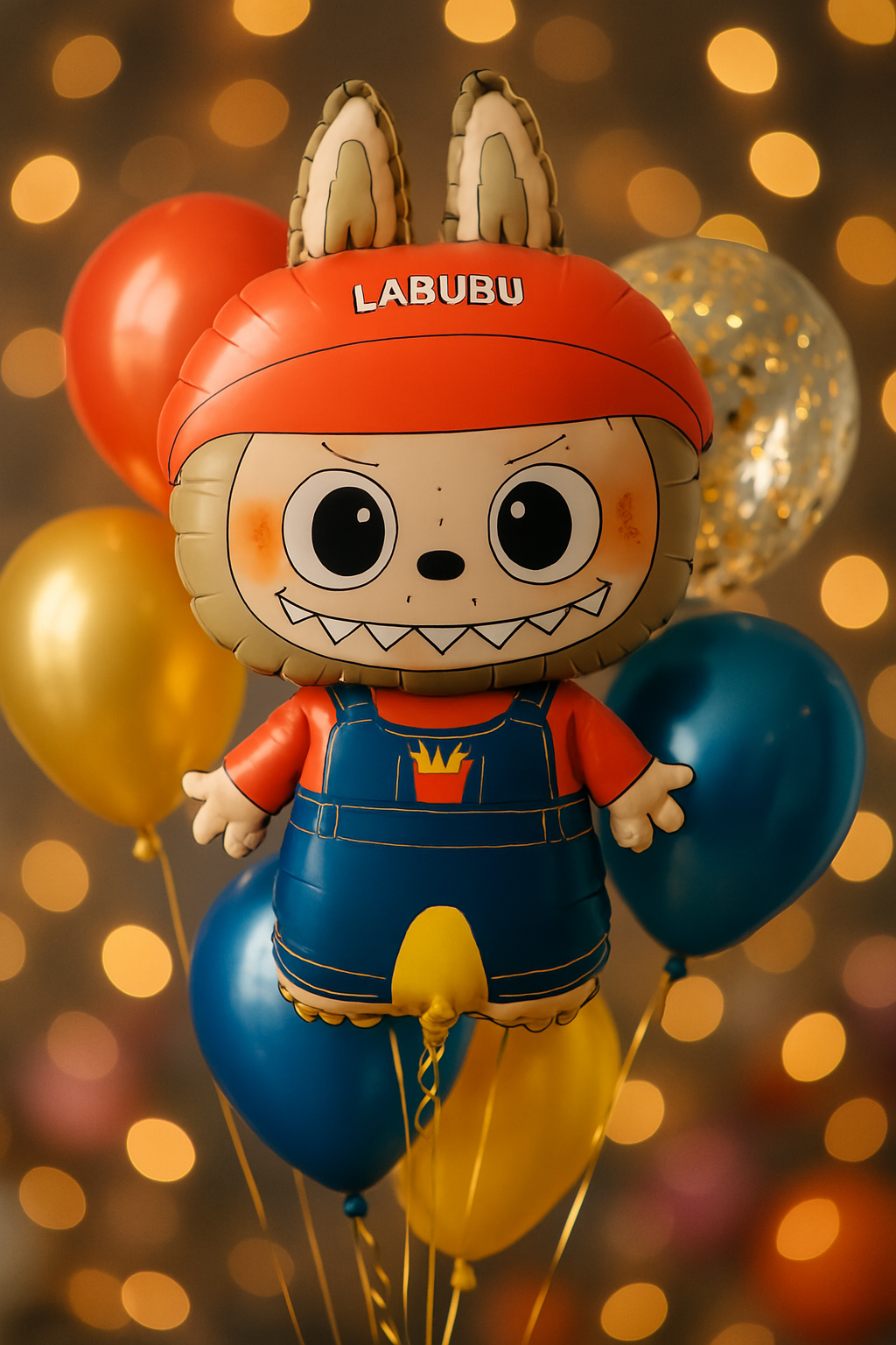 Foil balloon inspired by the character Labubu is the perfect addition to any party or event. Balloon presents Labubu with wide smile, big eyes and distinctive teeth. Dressed in a red hat with the word "LABUBU" and blue dungarees with a pocket from which French fries and a bottle stick out, the balloon attracts the attention of children and adults alike. Made of durable foil, it will work well as a birthday decoration, a gift for a Labub fan, or part of a photo shoot. Add magic and joy to any occasion!