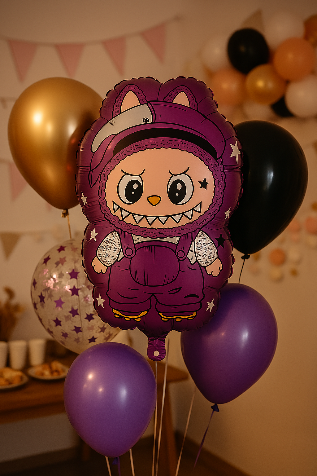 - Purple foil balloon depicting the character Labubu, measuring 70x44 cm.