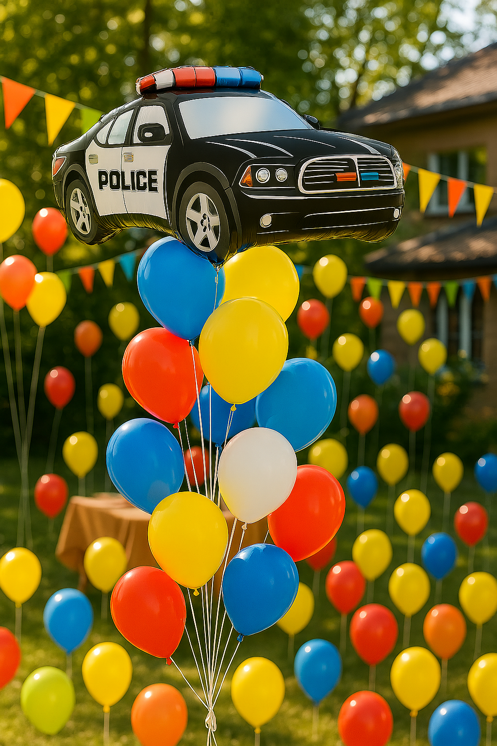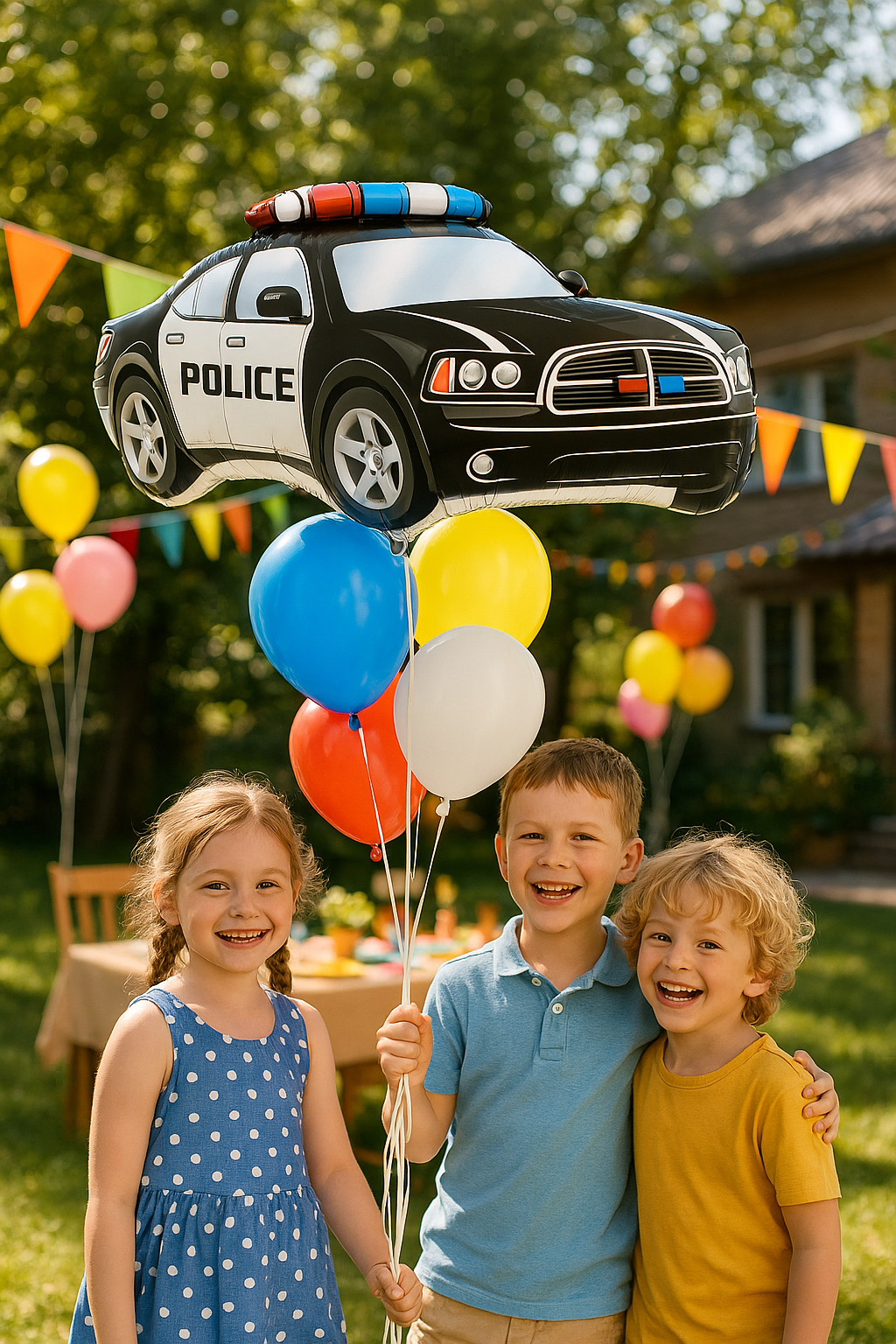 - Foil balloon in the shape of a police car with distinctive details such as the words "POLICE" and the traffic light on the roof.