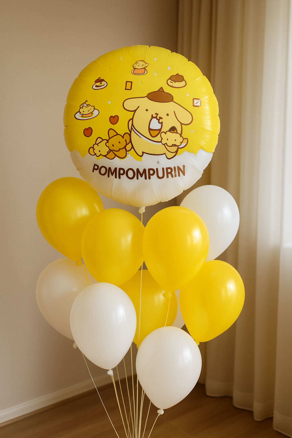 - An 18-inch diameter foil balloon depicting Sanrio's popular character Pompompurin, surrounded by sweet desserts and musical accents.