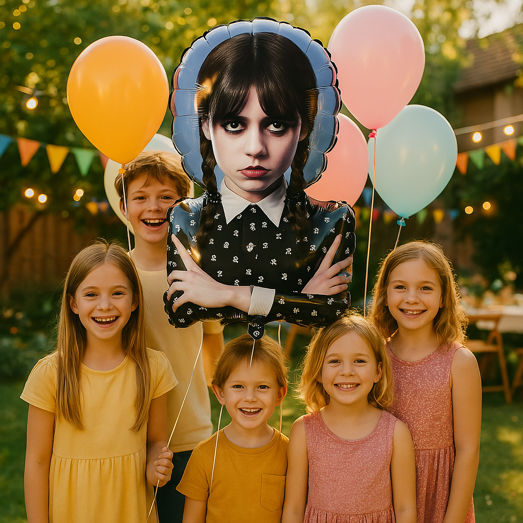 • Foil balloon depicting a character from the popular TV series Wednesday, wearing a distinctive outfit.(74cm*48cm)