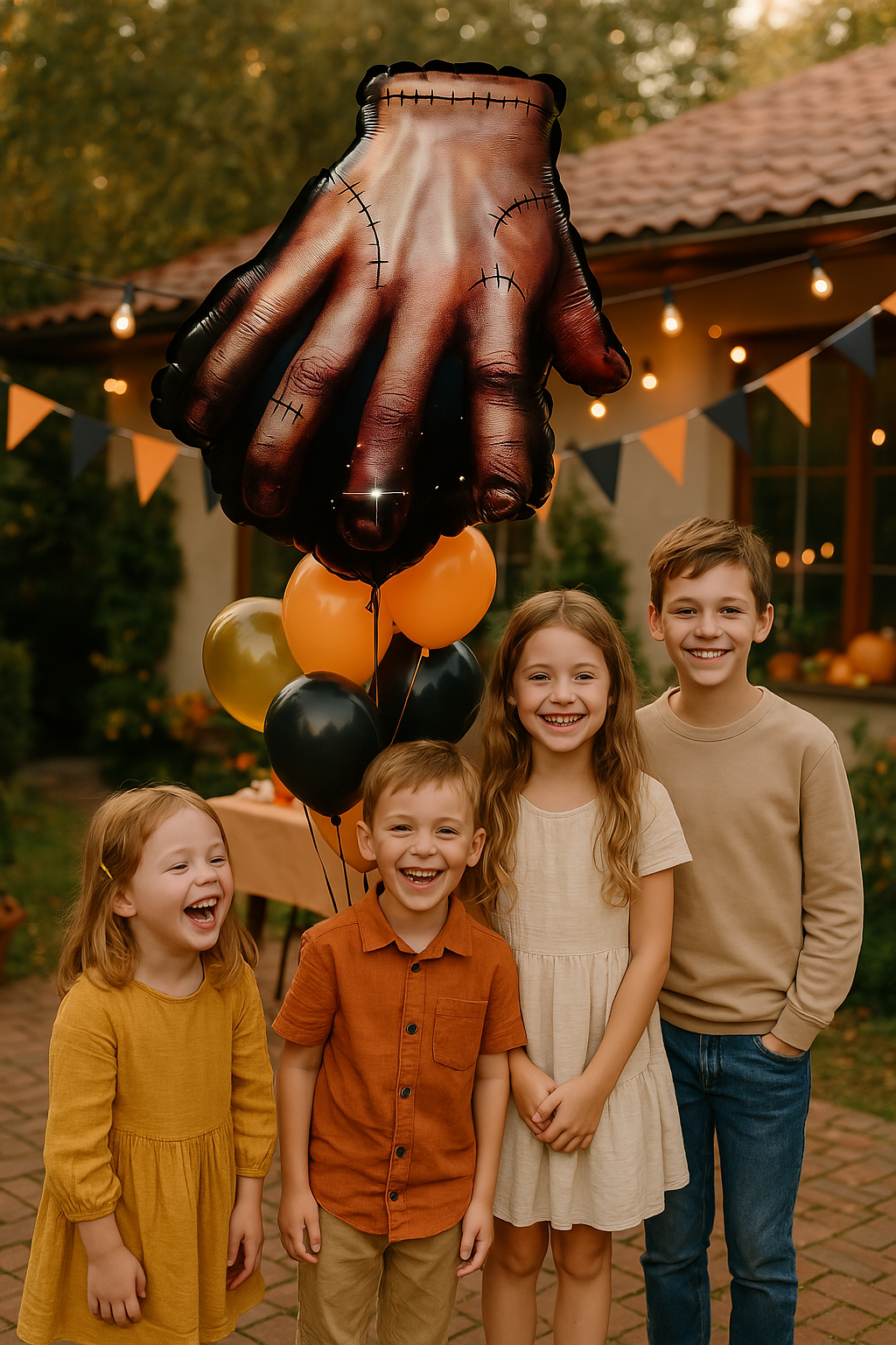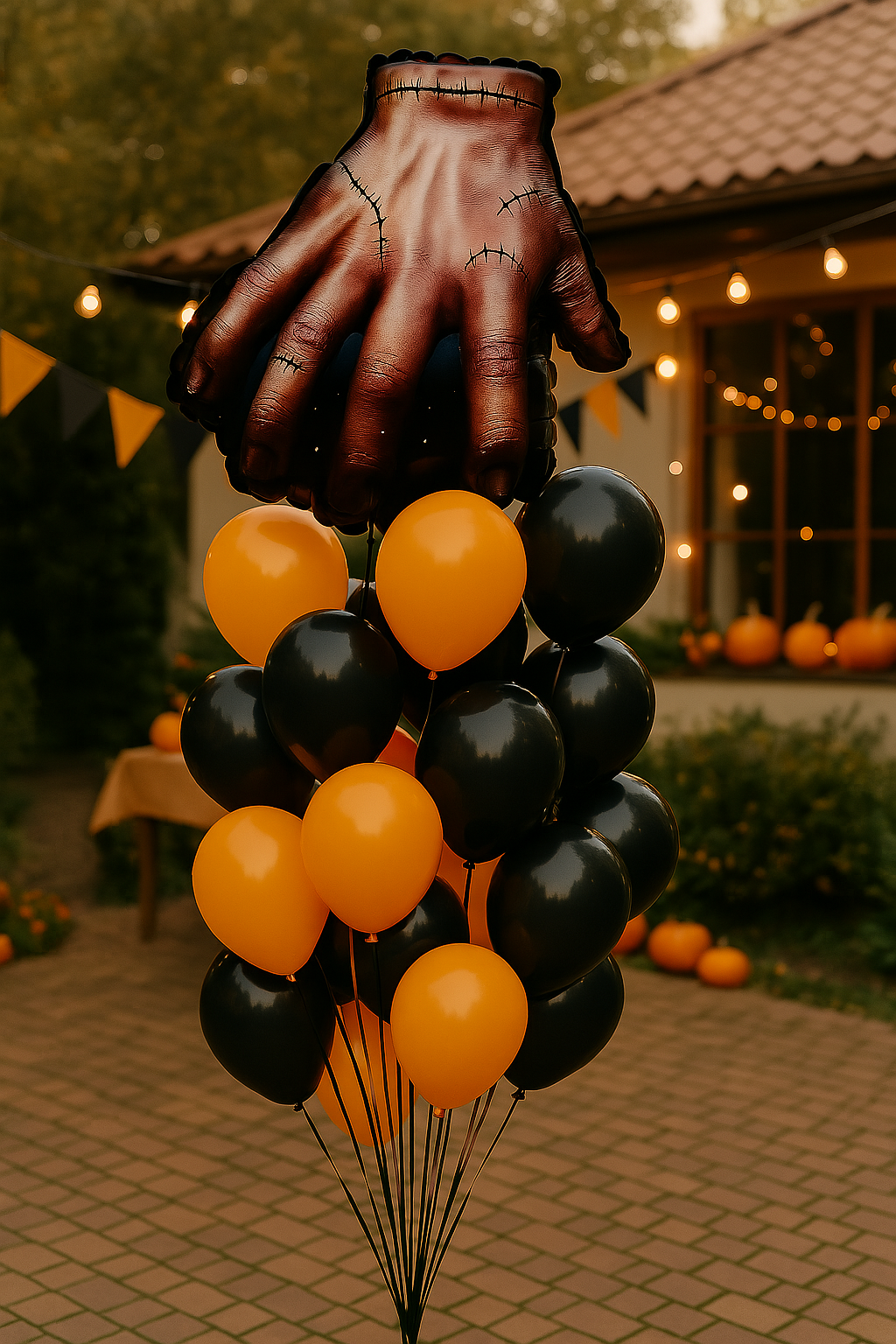 Foil balloon depicting a realistic Frankenstein hand (Wednesday), perfect for Halloween decoration. The balloon has the appearance of a stitched, scary hand with visible seams, which adds to its dark and mysterious character. A perfect addition to any themed party that is sure to attract attention and set the right mood.