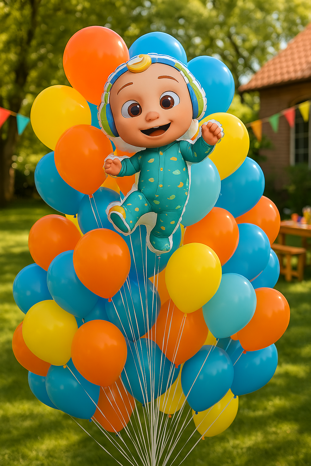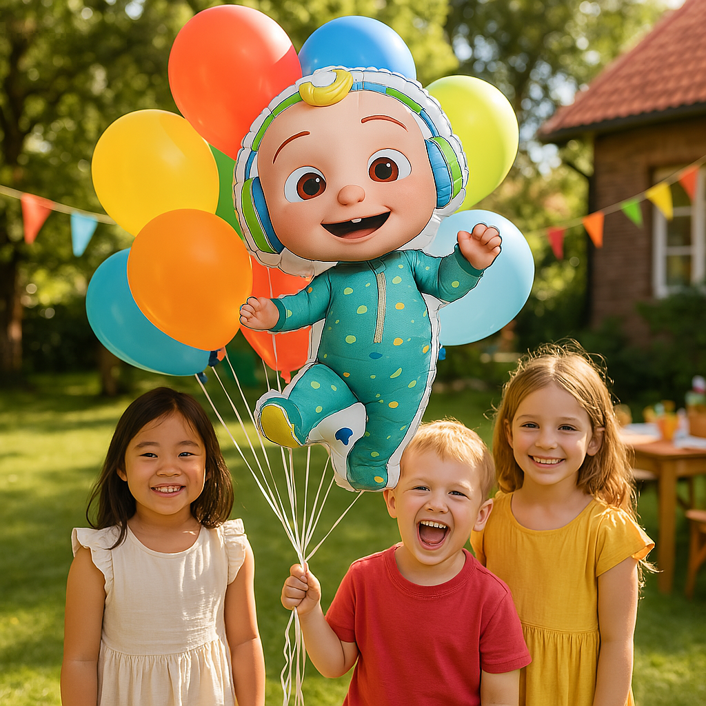 Balon foliowy w kształcie znanej postaci z kreskówki, idealny na dziecięce przyjęcia urodzinowe. Postać jest ubrana w zielony kombinezon ozdobiony uroczymi motywami rybek, na jej głowie znajdują się słuchawki w kolorach zielonym i niebieskim, a na czubku głowy widoczny jest charakterystyczny żółty detal przypominający loczek. Twarz balonowej postaci jest radosna i pełna energii, przyciągając uwagę dzieci i dorosłych swoim urokiem. Wycięcie balonu wzdłuż konturów postaci nadaje mu efekt trójwymiarowości, czyniąc go wyjątkowym dodatkiem na każdą okazję.