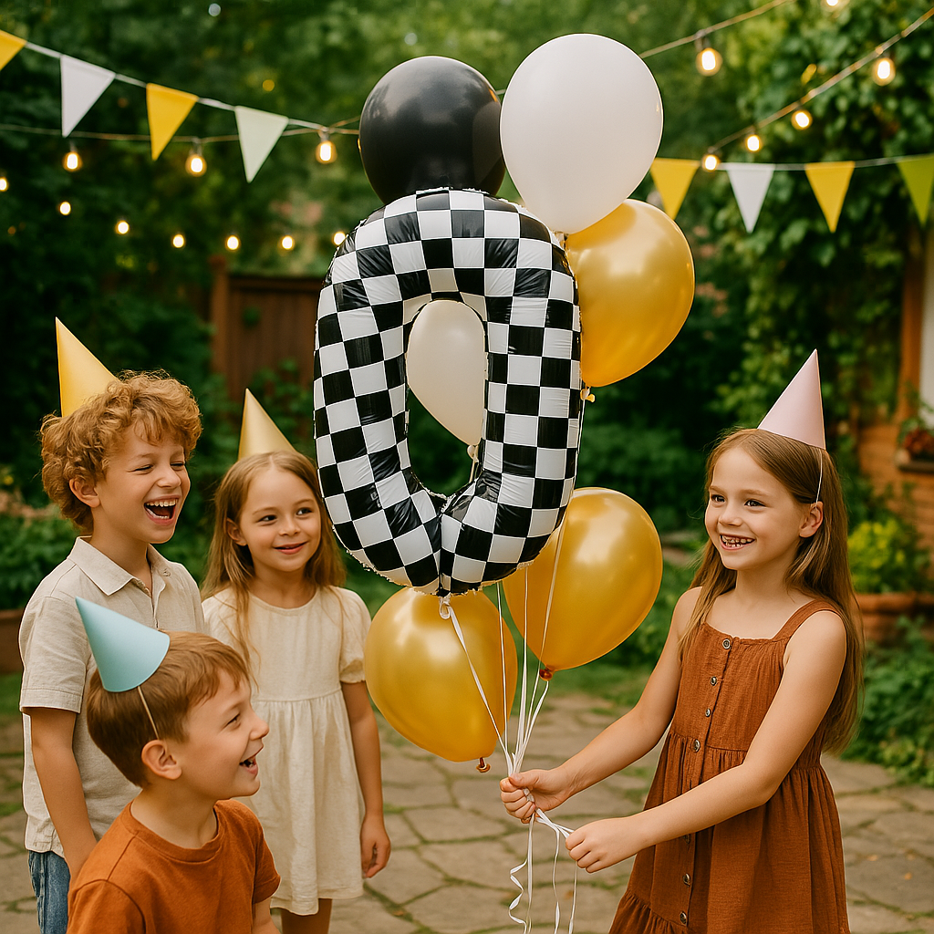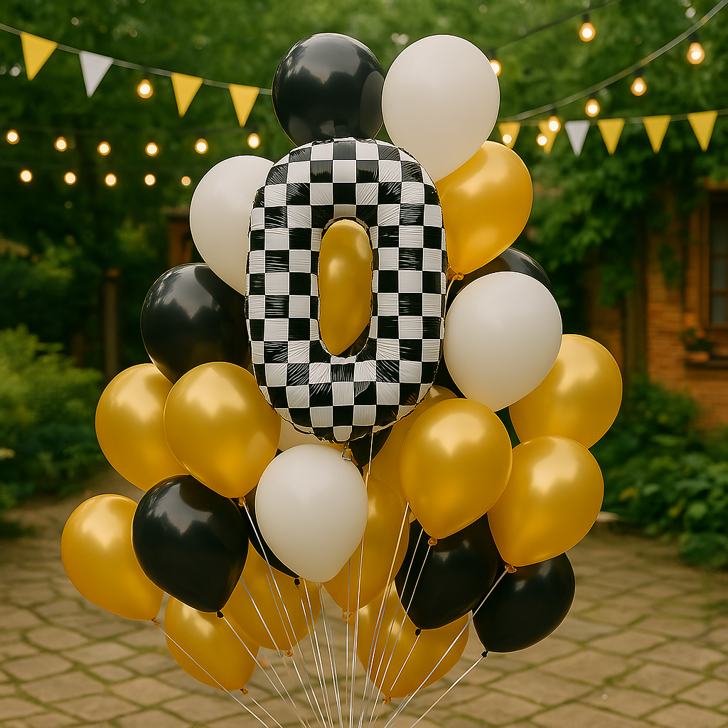 • Balon foliowy w kształcie cyfry 0, ozdobiony czarno-białym wzorem szachownicy.