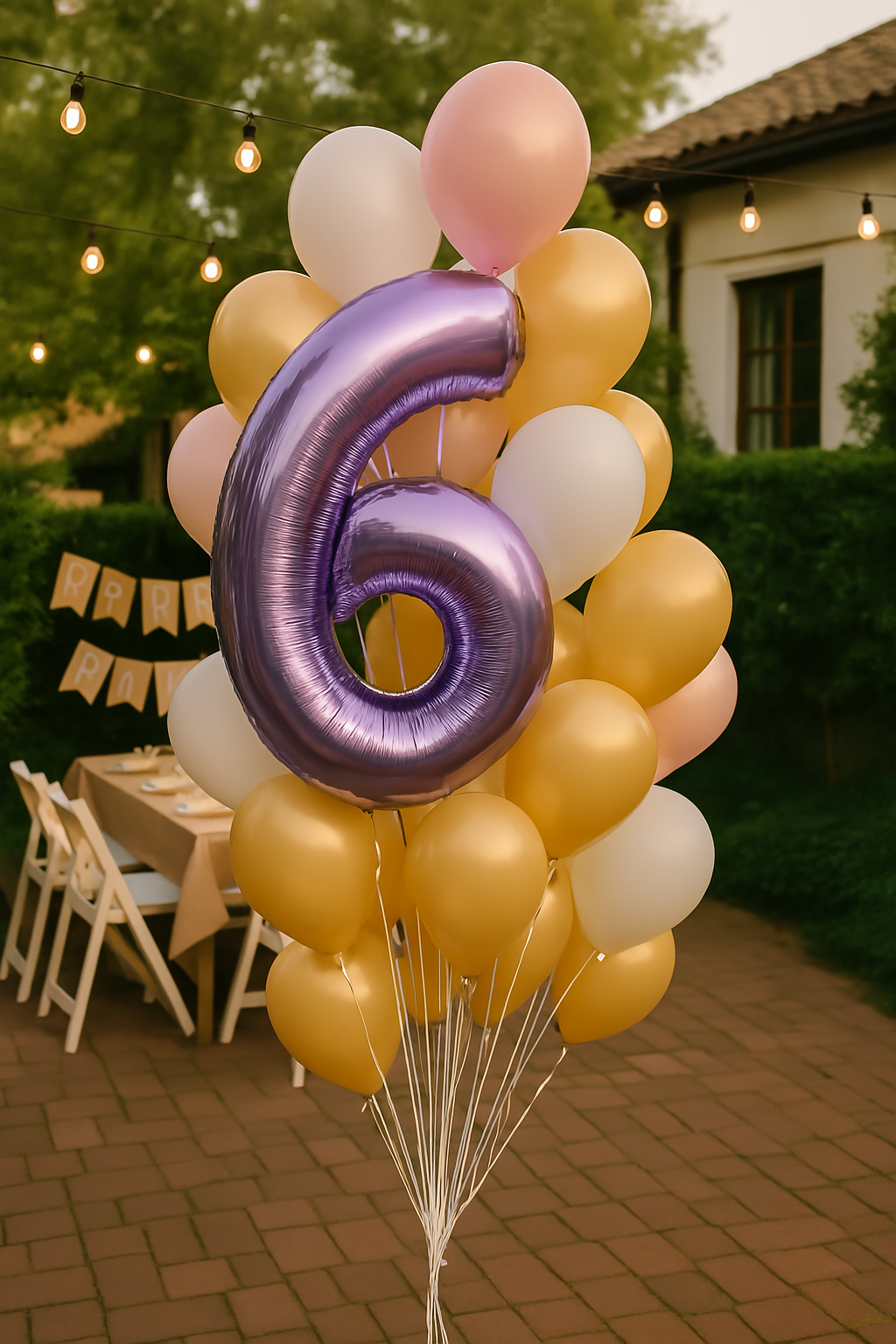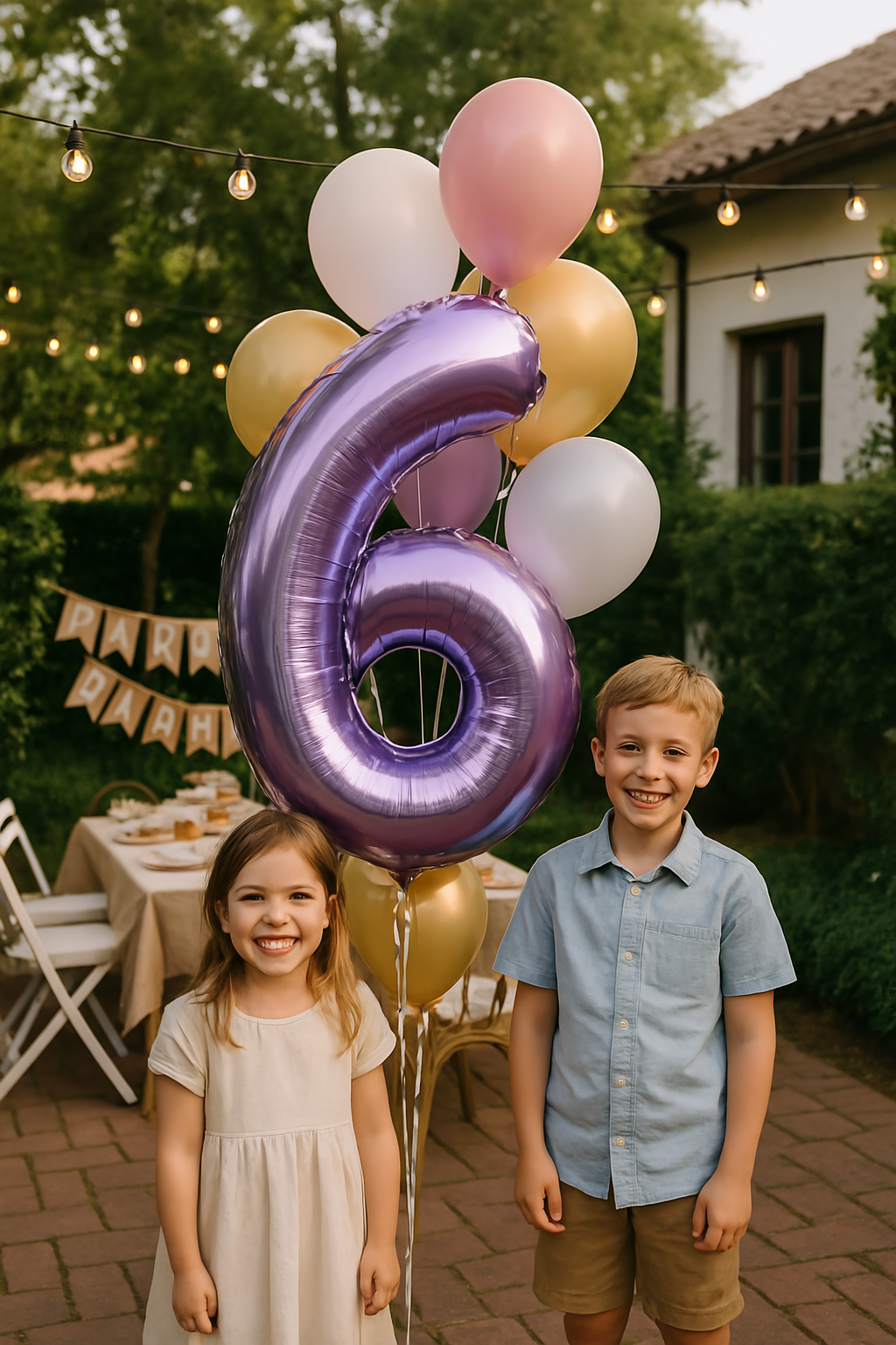 - Balon Foliowy Cyferka "6" Fioletowa (100 cm) – duży balon foliowy cyfra 6 w pięknym fioletowym odcieniu, świetny do dekoracji imprezowych.