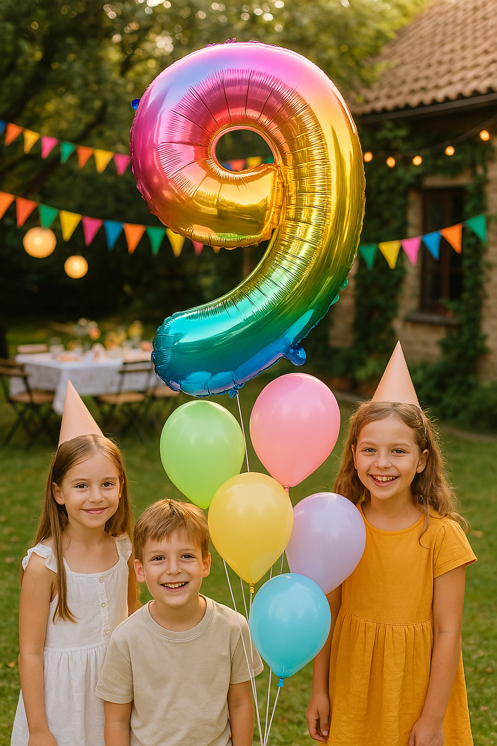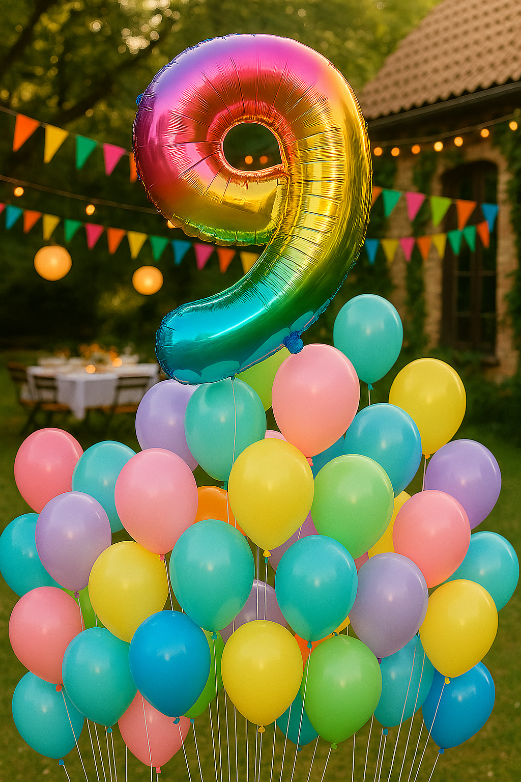 • Balon Foliowy Cyferka "9" Tęczowa (100 cm) – duży balon foliowy w kształcie cyfry 9 z efektem tęczy, idealny na urodziny i jubileusze.