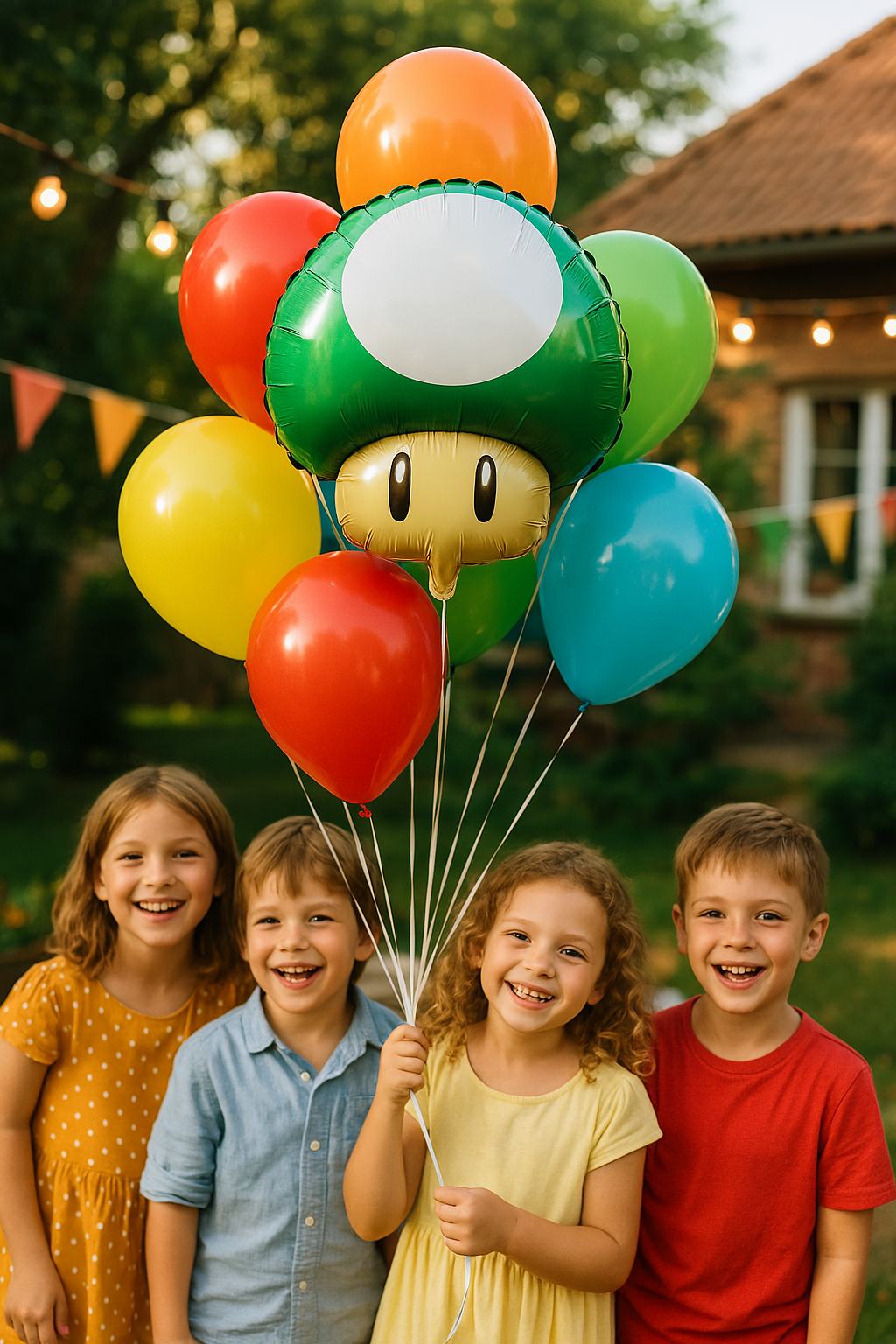 Balon foliowy w kształcie kultowego grzybka 1-Up z gry Super Mario Bros. Balon ma zielony kapelusz z białymi kropkami oraz charakterystyczne oczy na trzonie. Idealny na przyjęcia tematyczne, urodziny czy jako dekoracja dla fanów gier wideo. Wykonany z trwałego materiału, który zapewnia długotrwałe utrzymanie powietrza. Rozmiar balonu to około 45 cm.