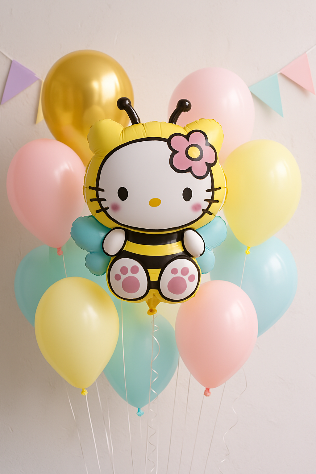 - Balon foliowy z postacią Hello Kitty w stroju pszczółki, doskonały na dekorację urodzinową lub imprezę tematyczną.