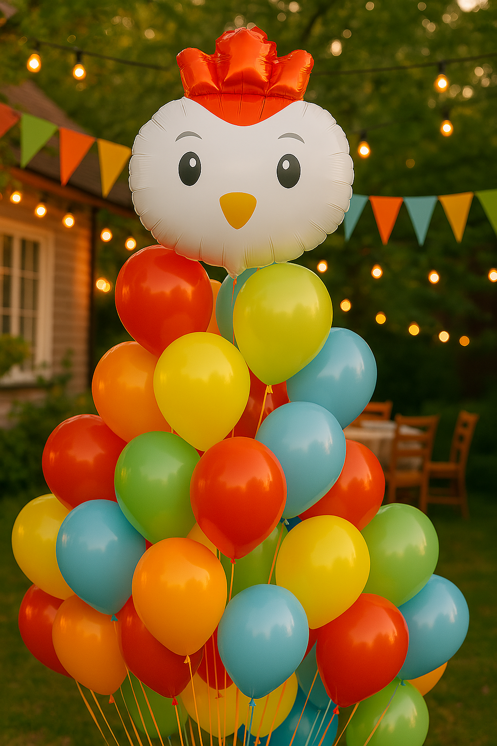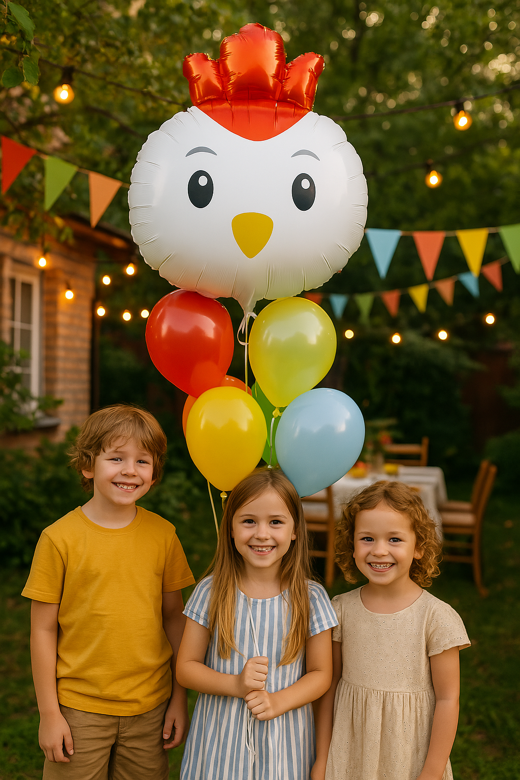 Balon foliowy w kształcie głowy kurczaka. Balon ma biały kolor z dużymi, czarnymi oczami oraz żółtym dziobem. Na górze balonu znajduje się czerwony grzebień, który dodaje charakterystycznego wyglądu. Balon jest idealny na różne okazje, takie jak urodziny, imprezy tematyczne czy dekoracje na przyjęcia. Jego uroczy design z pewnością przyciągnie uwagę i wywoła uśmiech na twarzach gości.