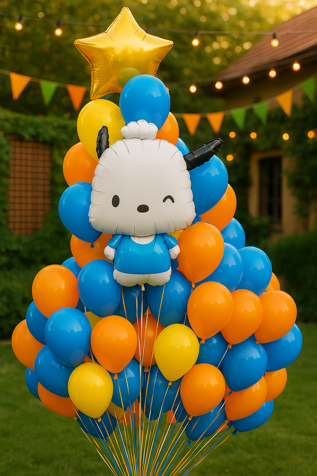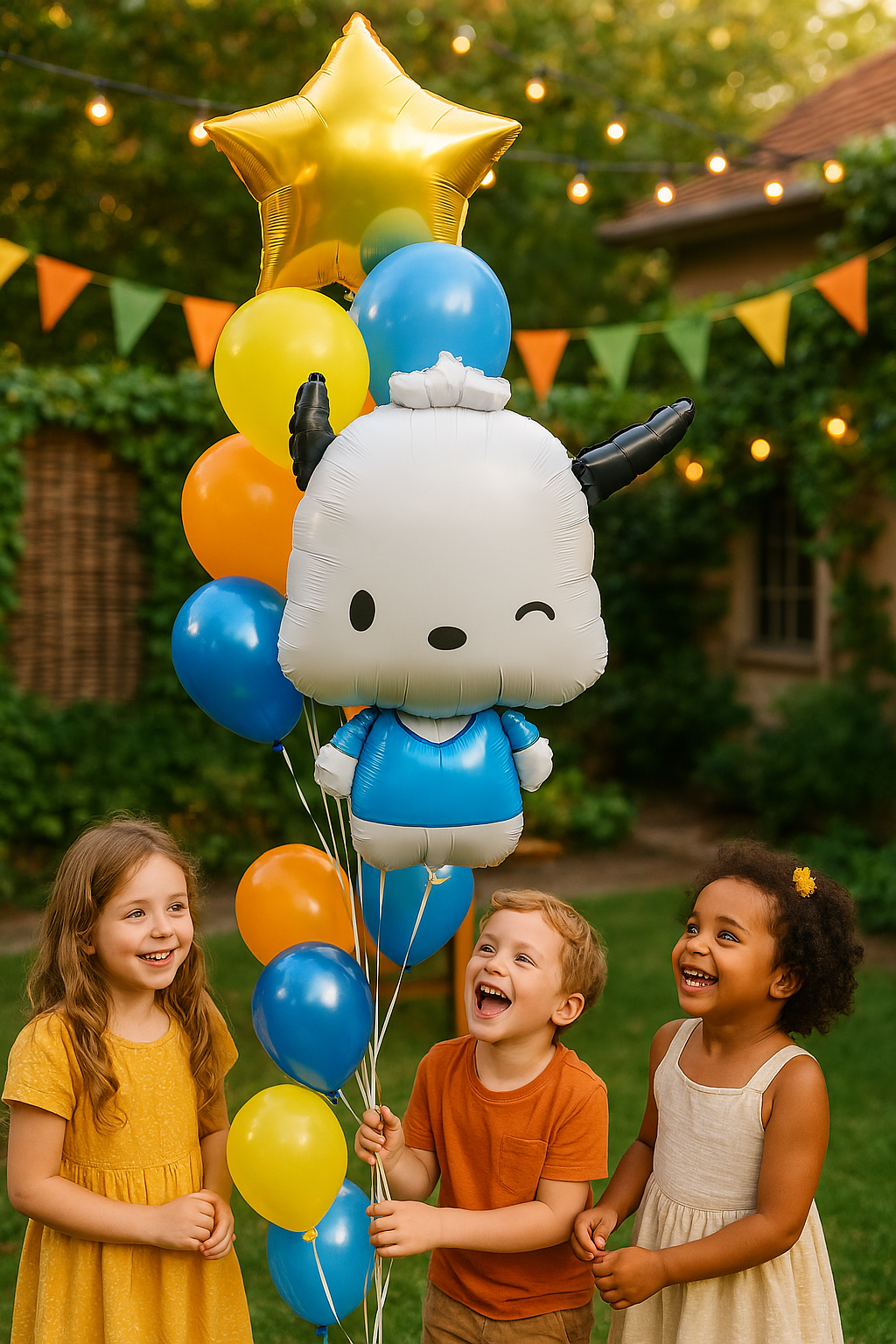 - Balon foliowy przedstawiający uroczą postać z kreskówki w niebieskiej koszulce.