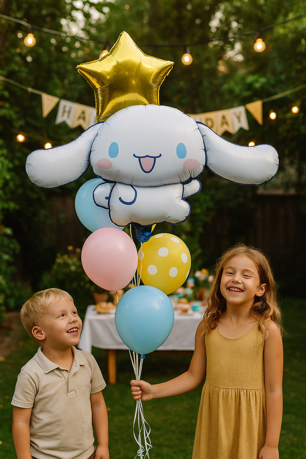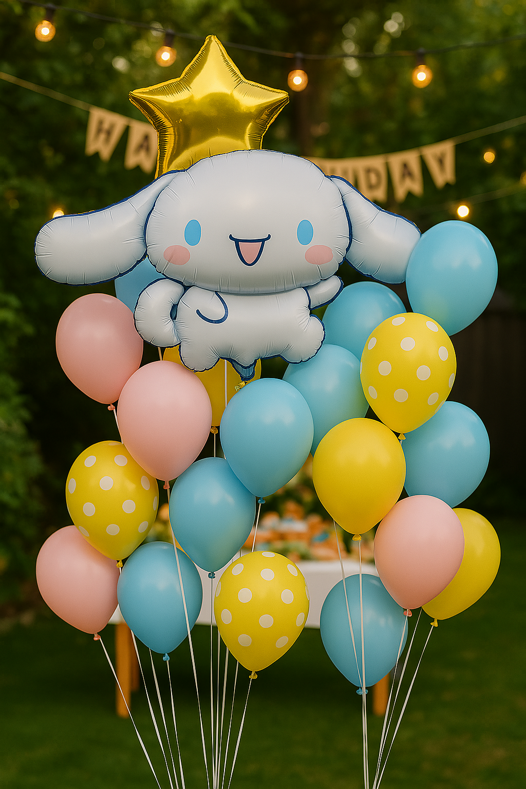 Balon foliowy przedstawiający postać Cinnamoroll, uroczego króliczka z popularnej serii Sanrio. Balon ma kształt postaci z dużymi, białymi uszami i uśmiechniętą buzią. Idealny na przyjęcia urodzinowe, imprezy tematyczne lub jako dekoracja pokoju dziecięcego. Wykonany z trwałego materiału, który zapewnia długotrwałe utrzymanie powietrza. Balon można napełnić powietrzem. Wymiary: około 75 cm x 48 cm.